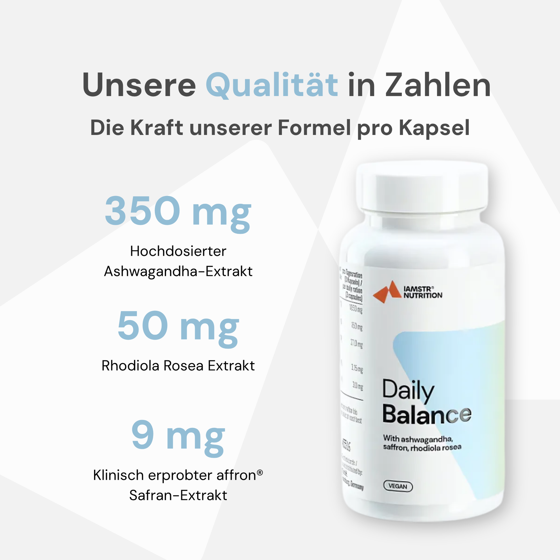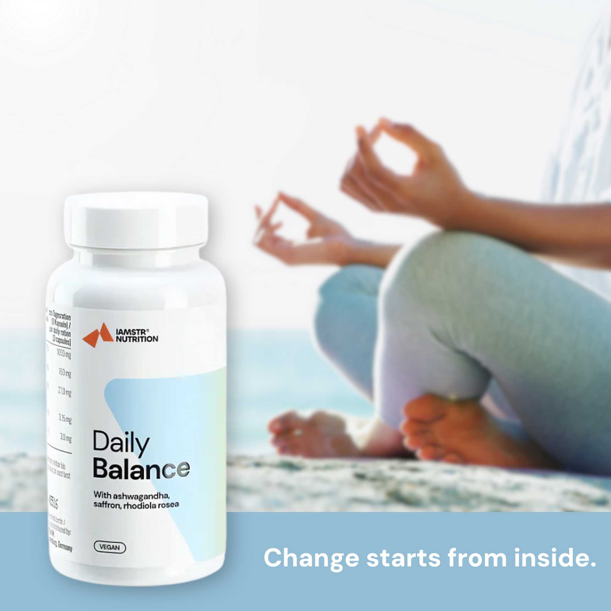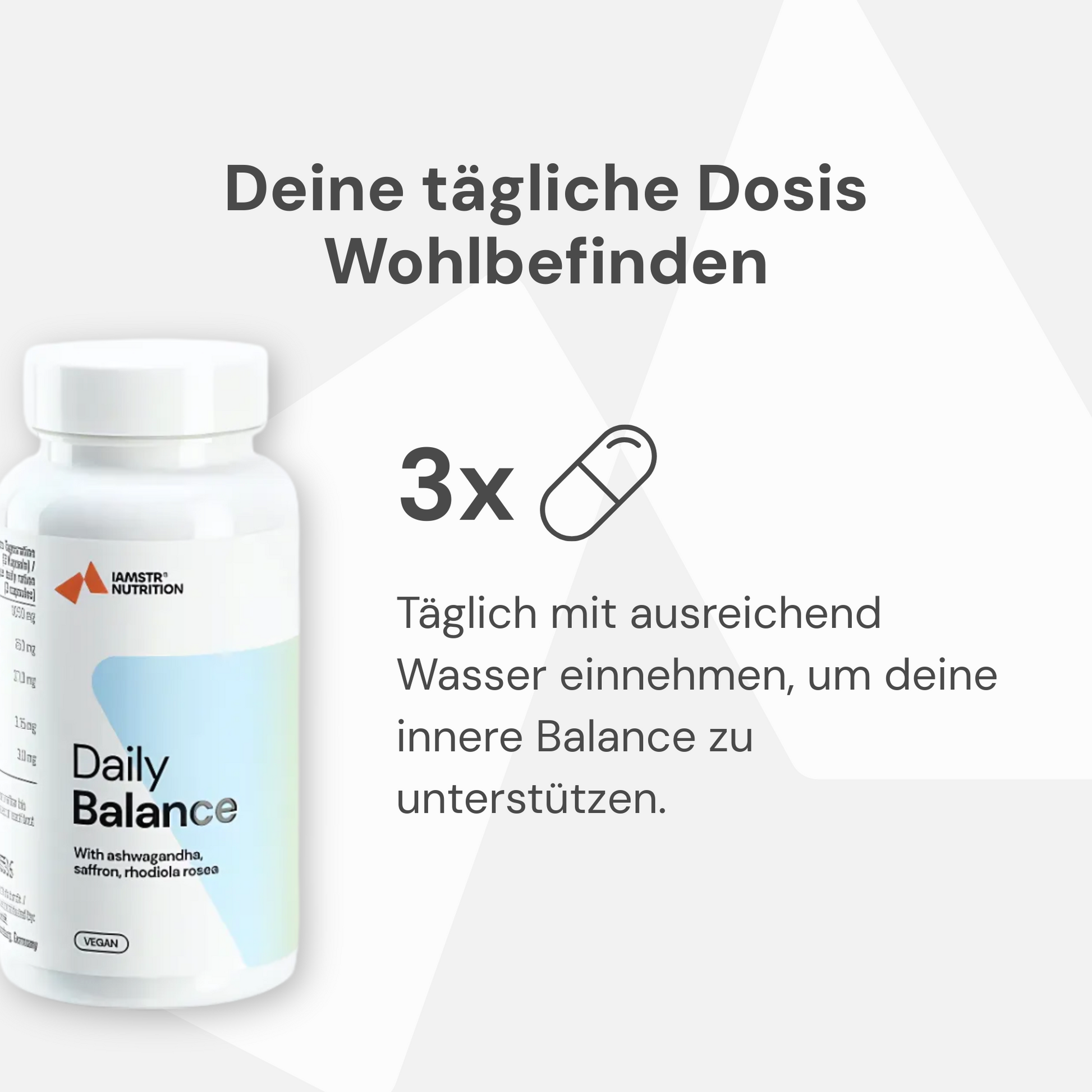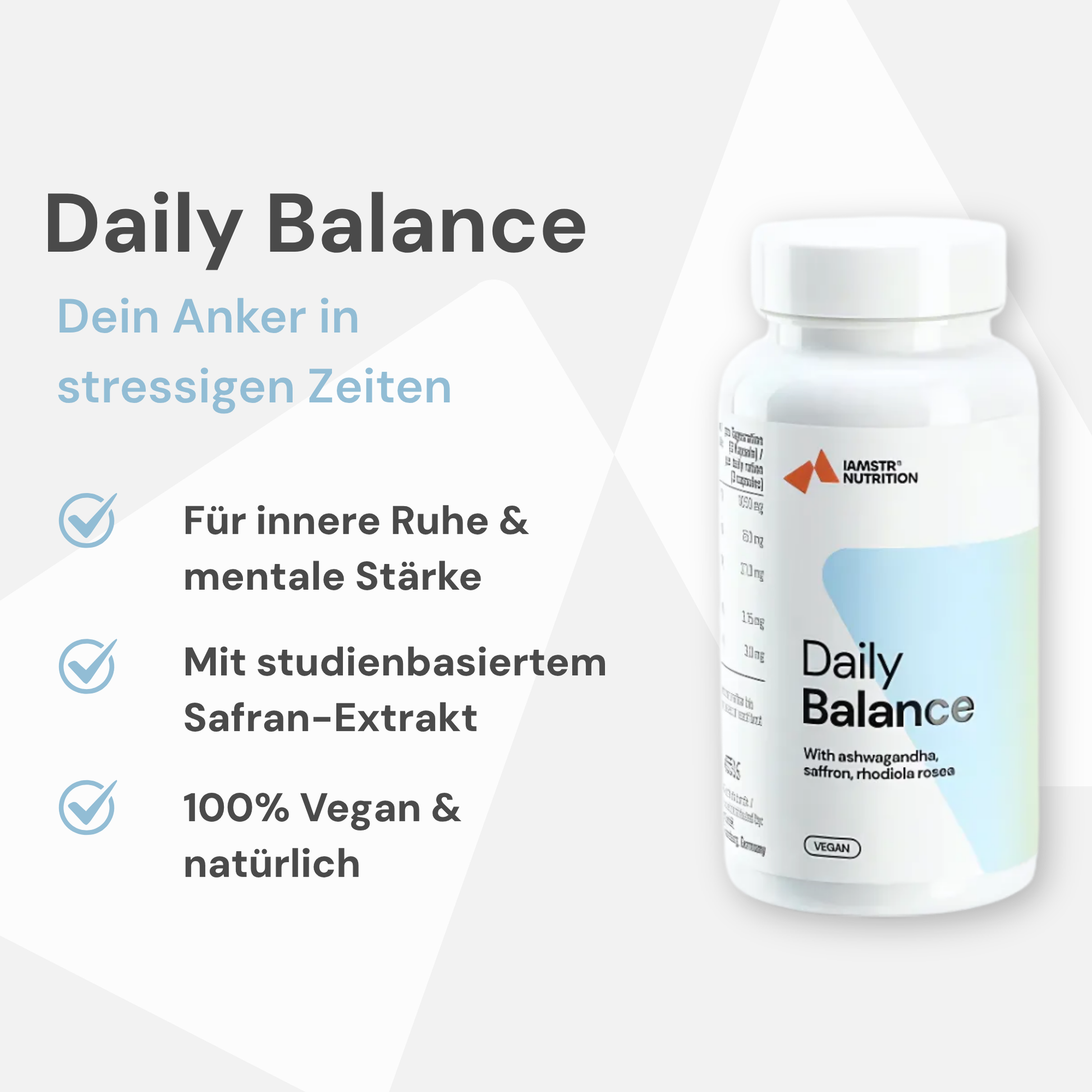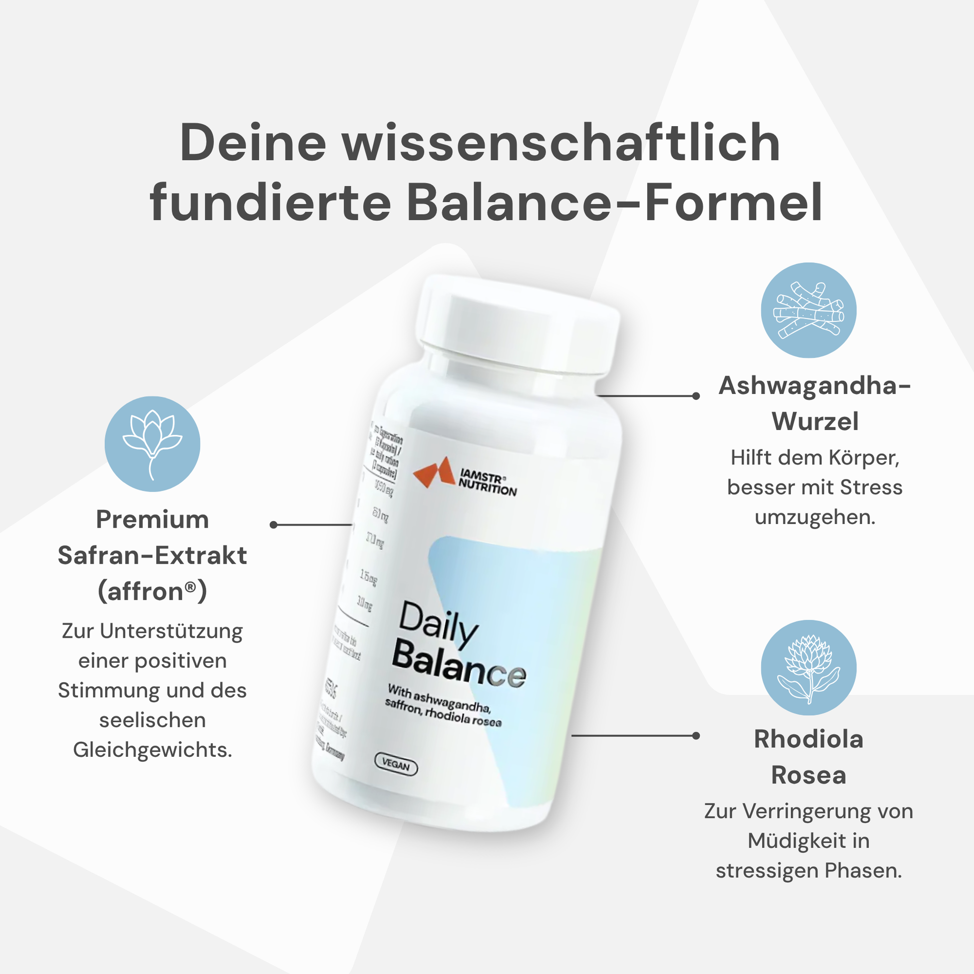Daily Balance kombiniert die Kraft von Ashwagandha, Rhodiola Rosea und Safran Extrakt, um dir dabei zu helfen, stressfreier und energievoller durch den Tag zu kommen.
