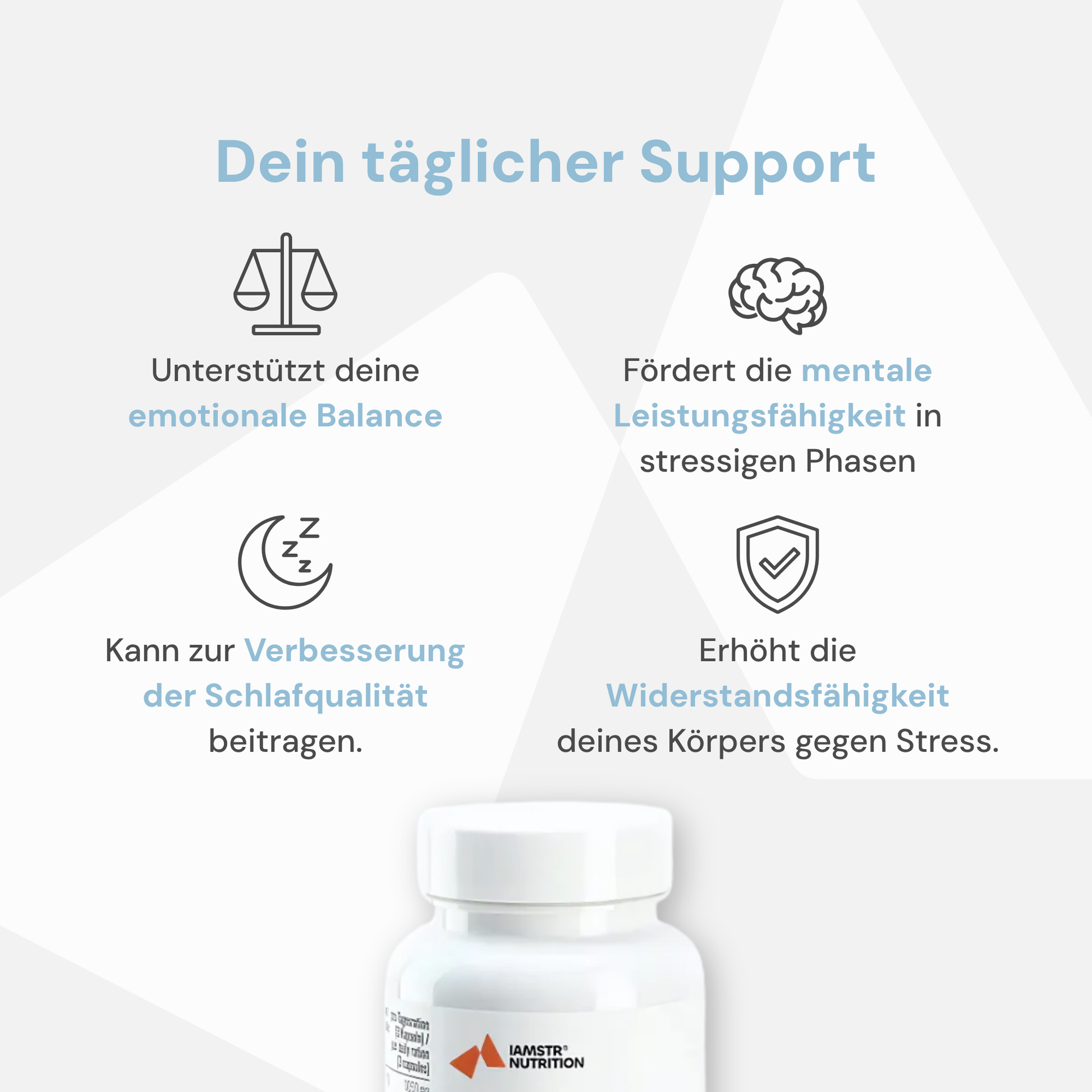 Ashwaghanda kann deine Stressbewältigung unterstützen und kann ein entspanntes sowie ein ausgeglichenes Gefühl fördern. Es kann dabei helfen, deine innere Ruhe zu finden und kann gleichzeitig deine geistige Klarheit unterstützen.