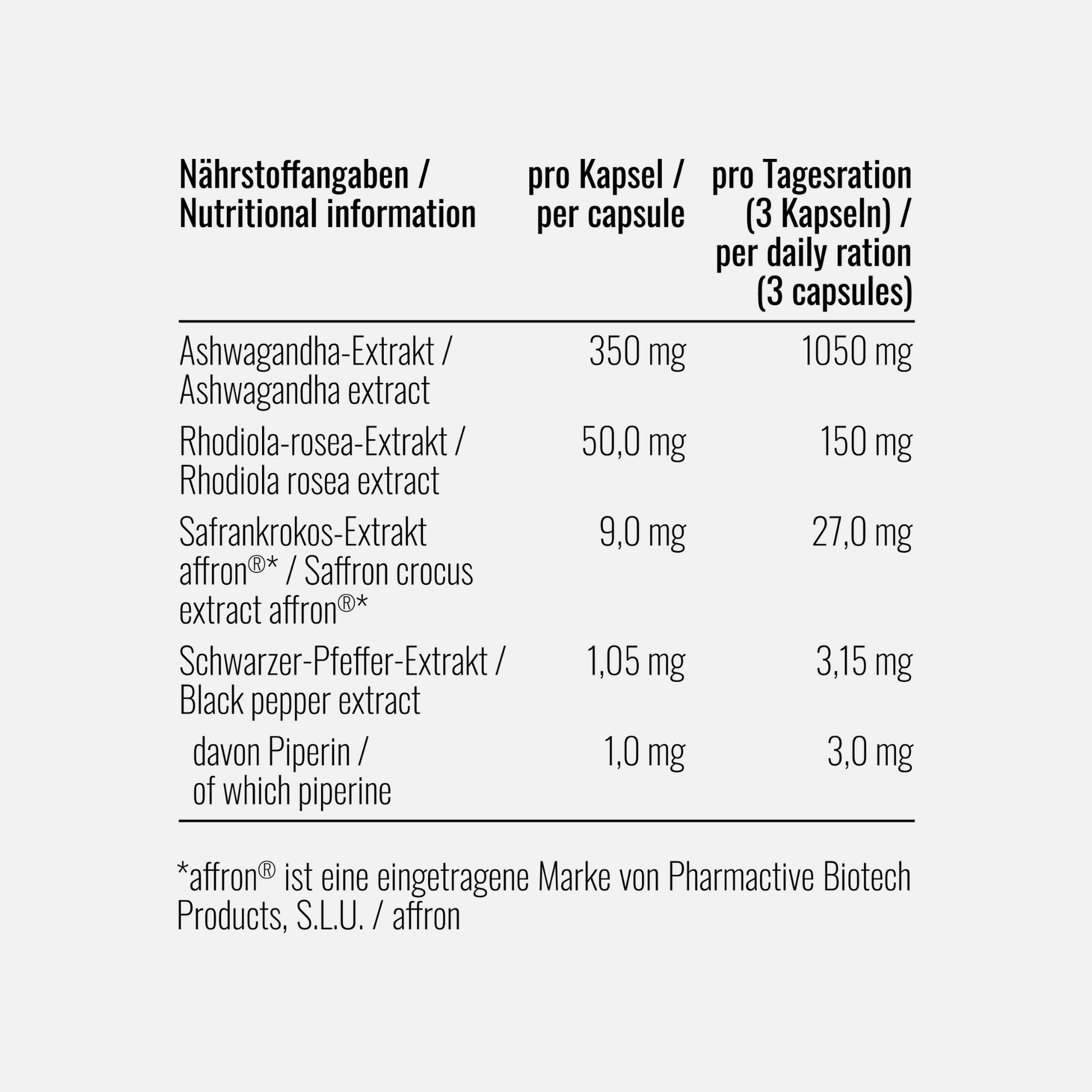 Food supplement with ashwagandha extract. In- gredients: Ashwagandha extract, coating agent: hydro- xypropyl methylcellulose (capsule shell), rhodiola rosea extract, saffron crocus extract (crocus sativus affron®)*, black pepper extract.