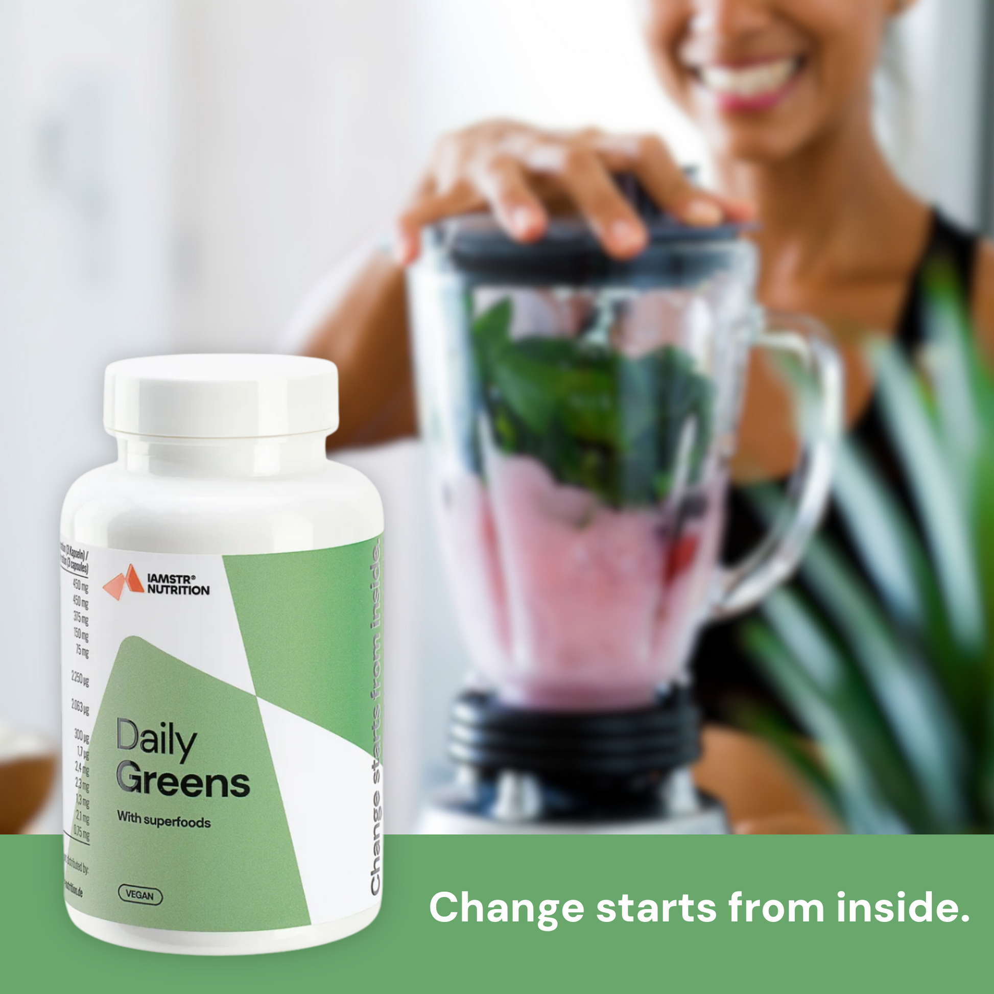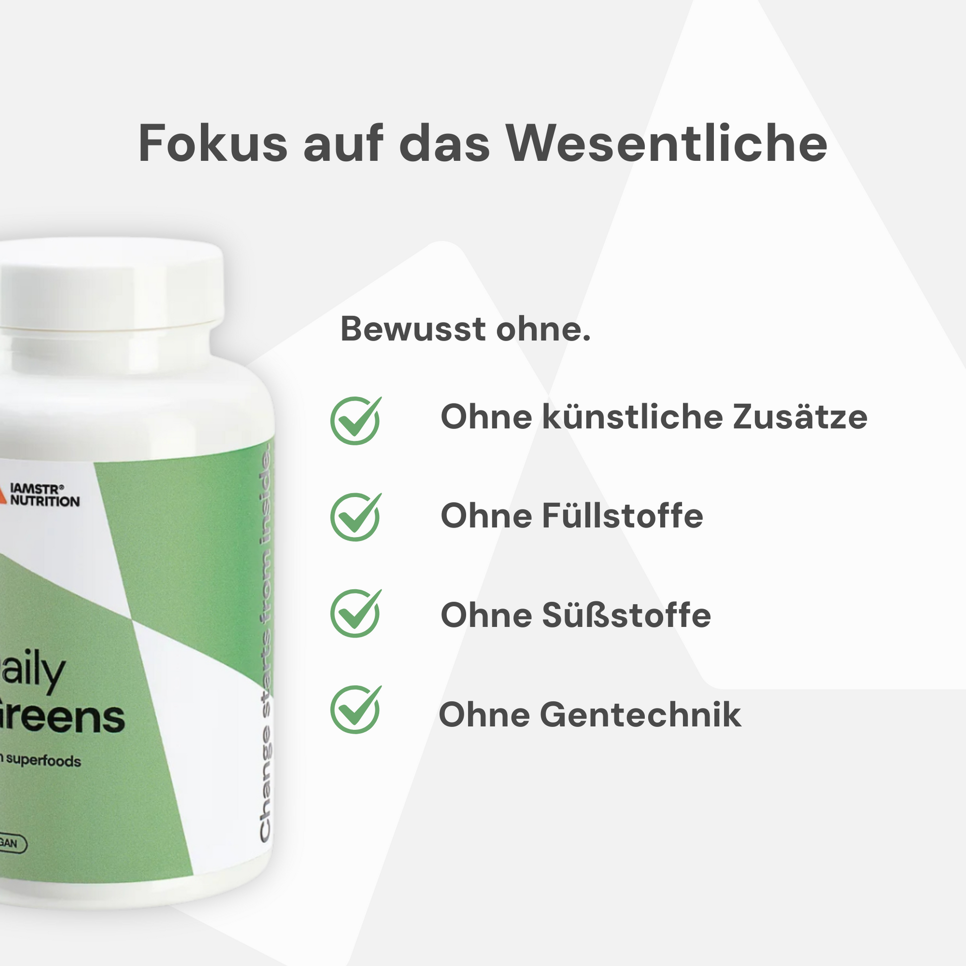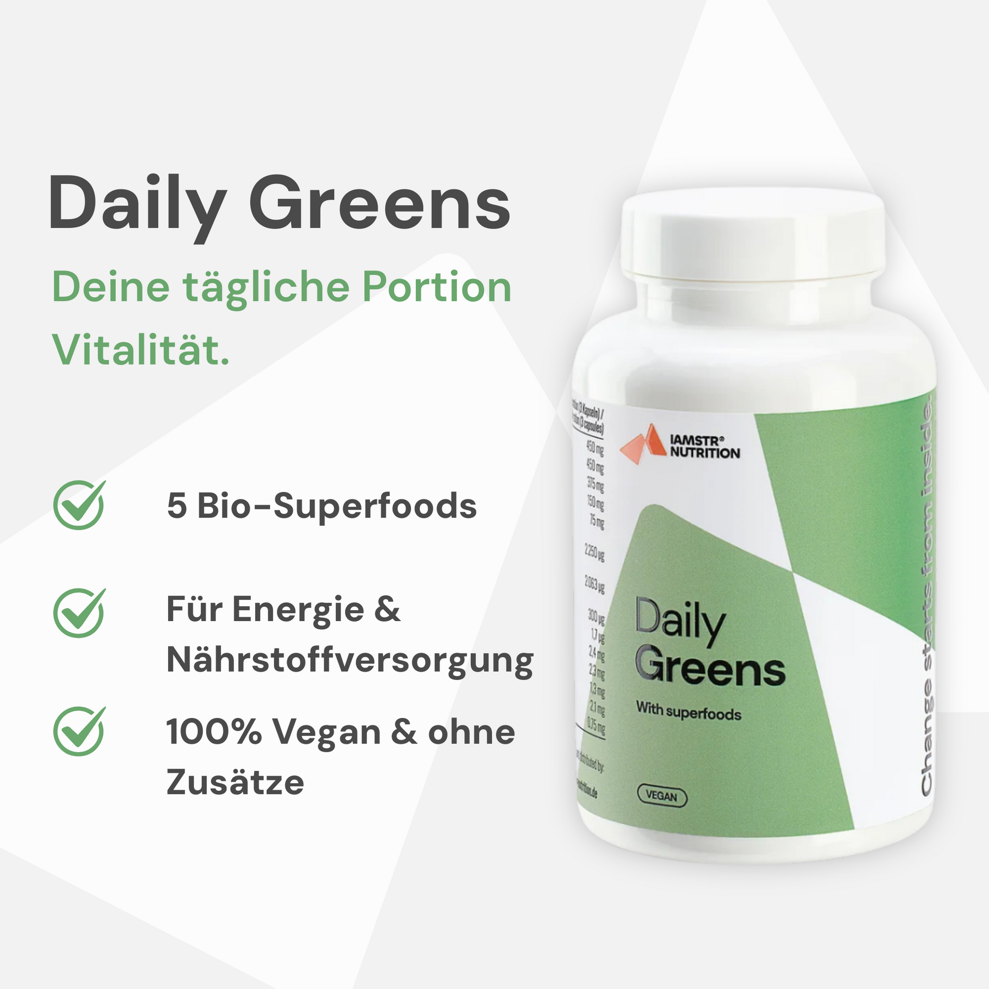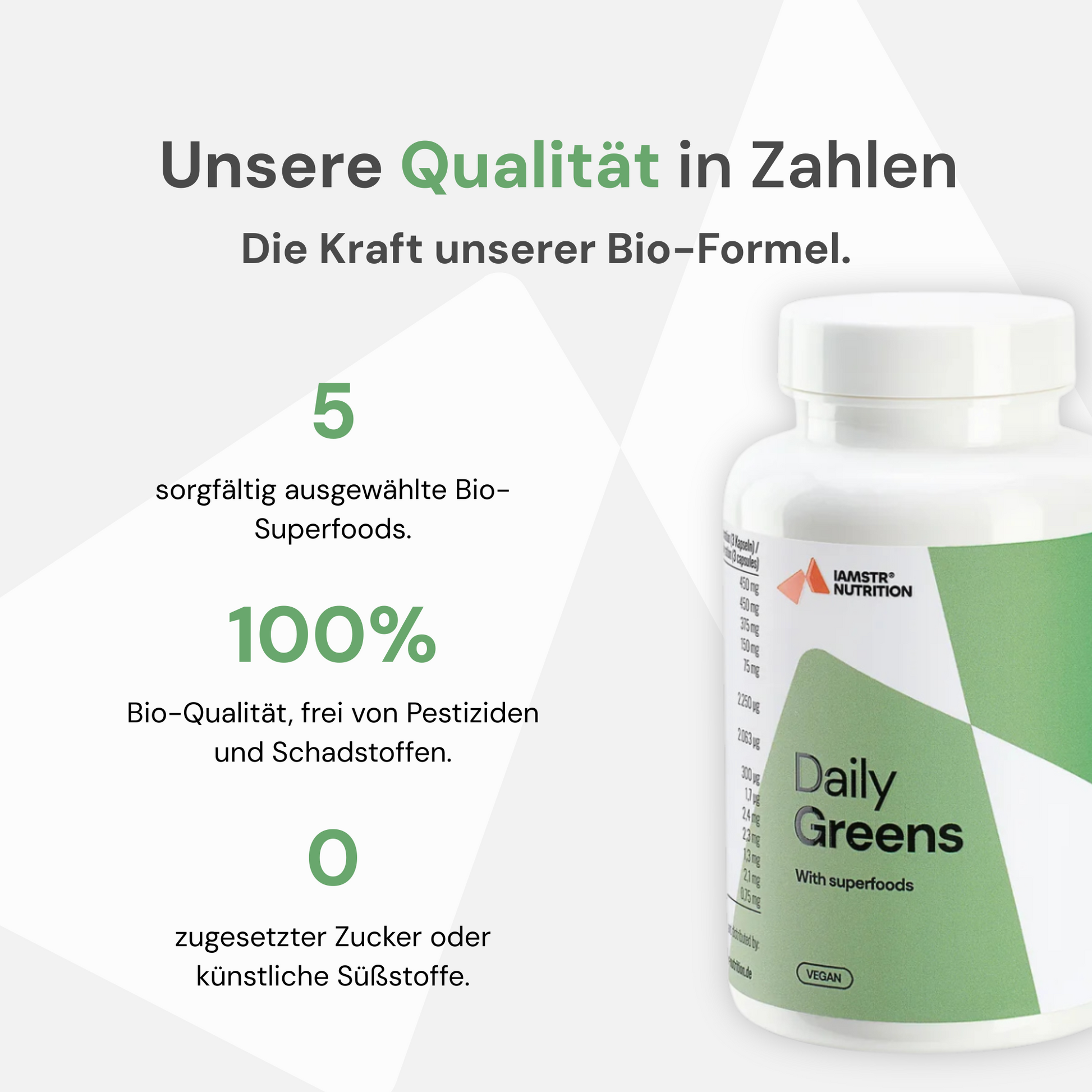 Bio Daily Greens bietet dir eine kraftvolle Mischung aus sorgfältig ausgewählten Bio-Pflanzenstoffen und Wildkräutern, die dir helfen, deine tägliche Nährstoffzufuhr auf natürliche Weise zu verbessern. Diese grüne Superfood-Formel ist ideal für alle, die ihre Ernährung aufpeppen und ihre Gesundheit unterstützen möchten.