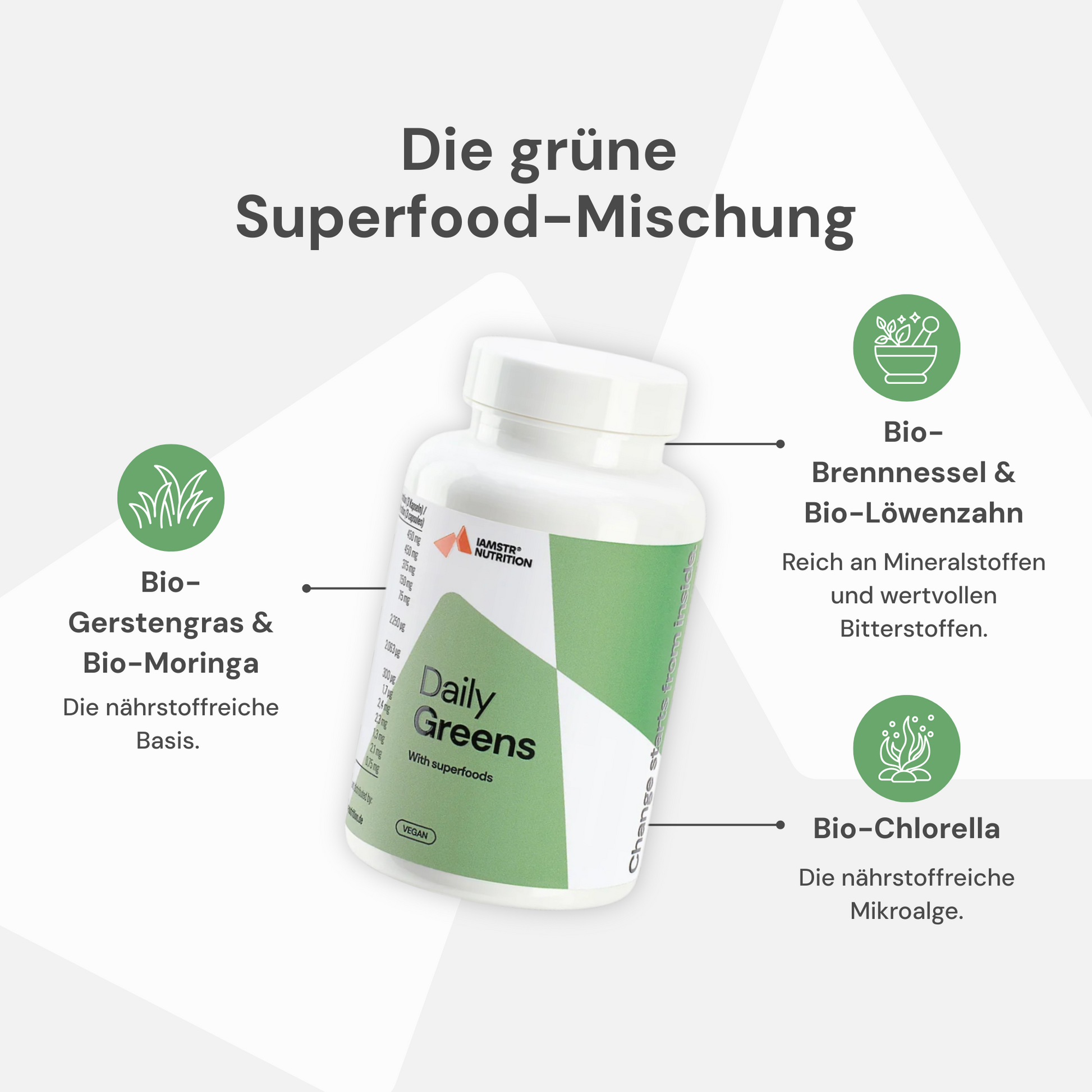 Bio Daily Greens ist die perfekte Ergänzung für deine tägliche Ernährung. Mit Bio Gerstengras, Moringa, Brennnessel, Löwenzahn und Chlorella erhältst du eine geballte Ladung an Nährstoffen, die deine Gesundheit unterstützen und dir neue Energie verleihen.