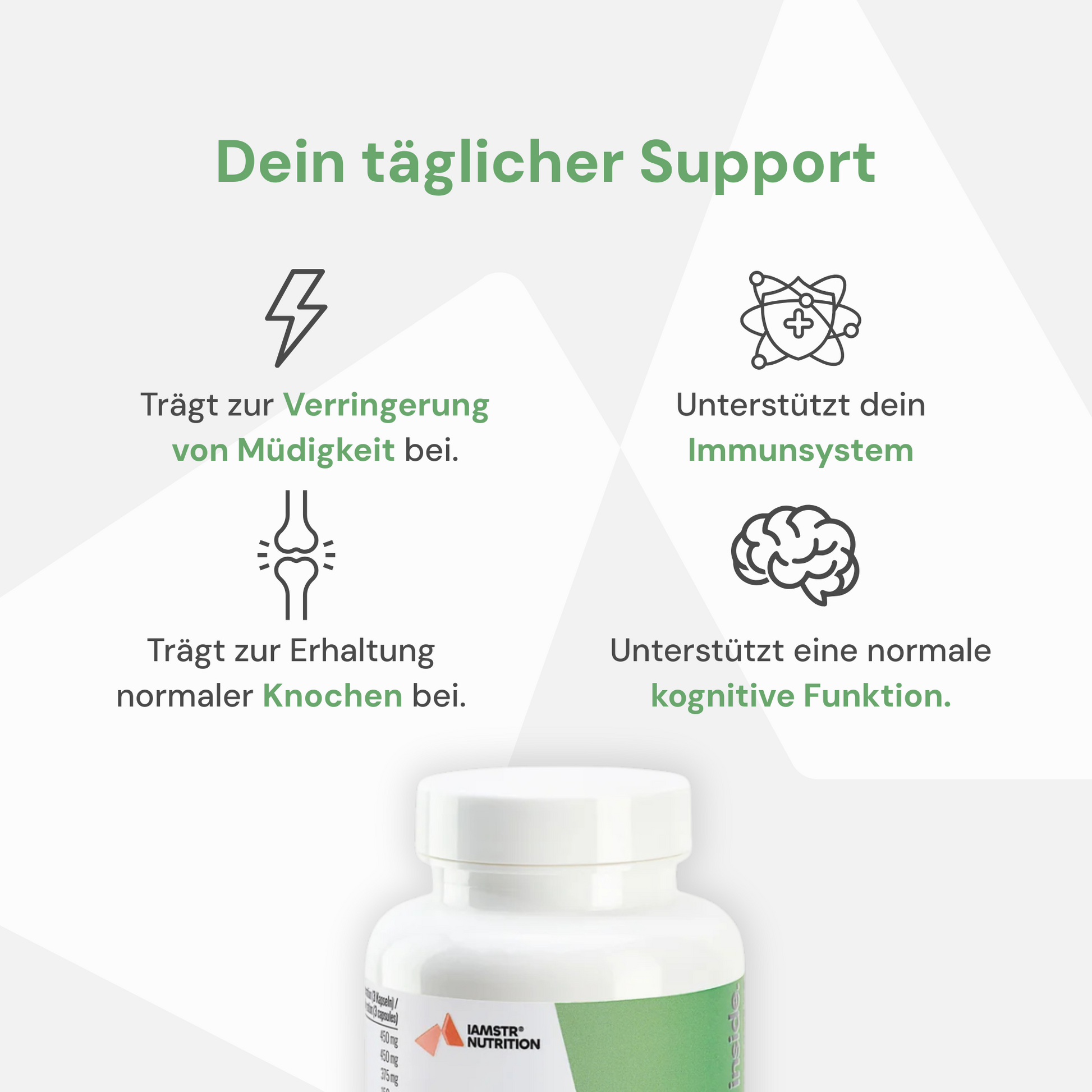 Hinweis: Die angegebene empfohlene tägliche Verzehrmenge darf nicht überschritten werden. Nahrungsergänzungsmittel sind kein Ersatz für eine ausgewogene und abwechslungsreiche Ernährung sowie eine gesunde Lebensweise. Außerhalb der Reichweite von kleinen Kindern lagern.