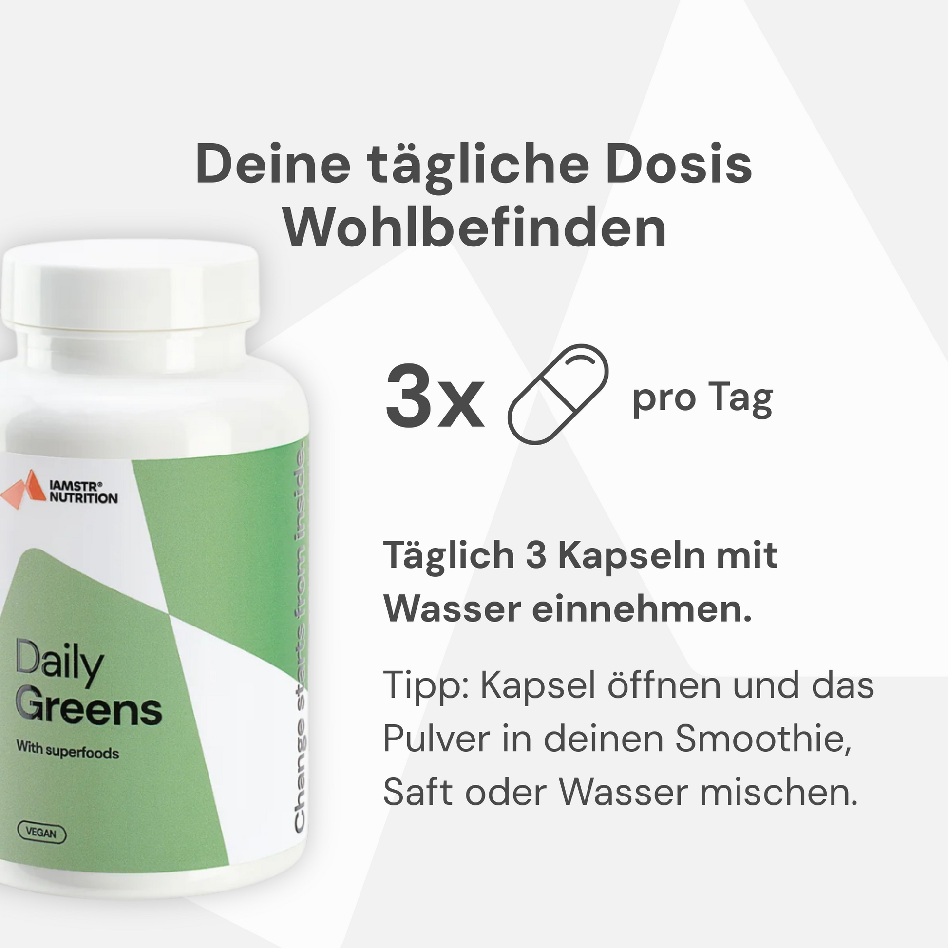 Ob als Kapseln eingenommen, in einen Gemüse-Obst-Smoothie gemischt, in Wasser gelöst oder als Shot getrunken: Unsere Bio Daily Greens-Mischung aus verschiedenen Pflanzenpulvern ermöglicht es dir, auf einfachste Art und Weise ein breites Spektrum an Mikronährstoffen aufzunehmen.