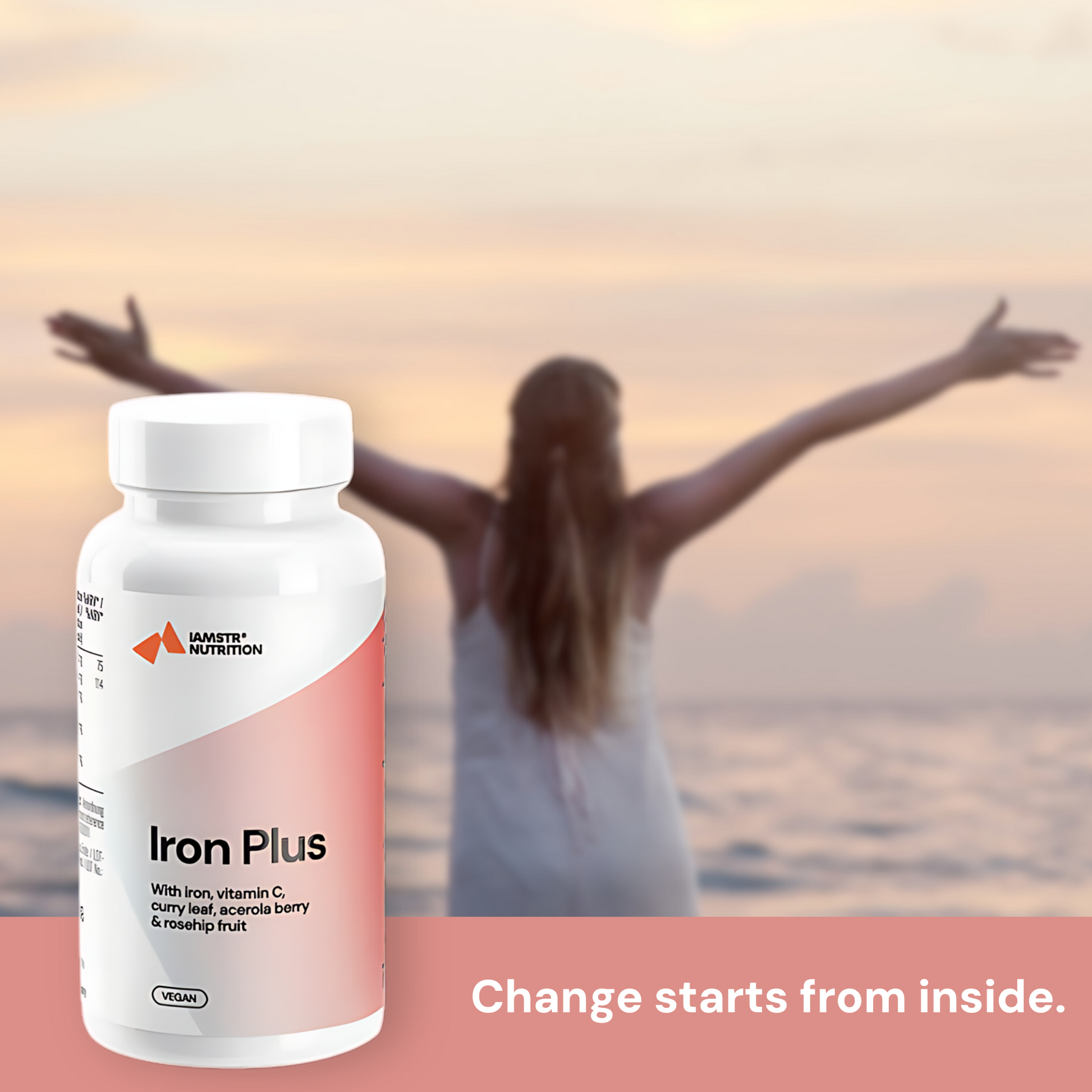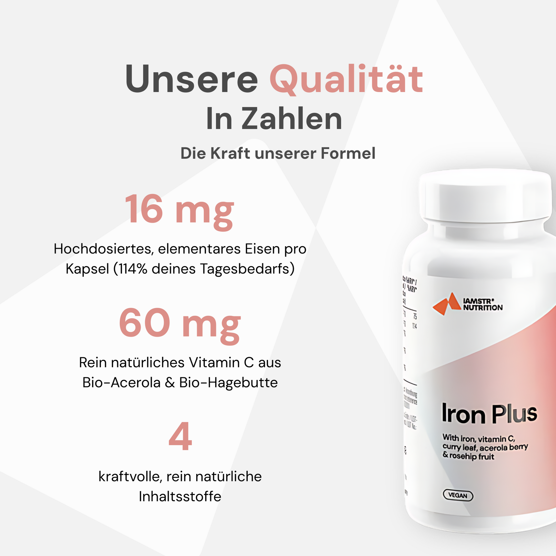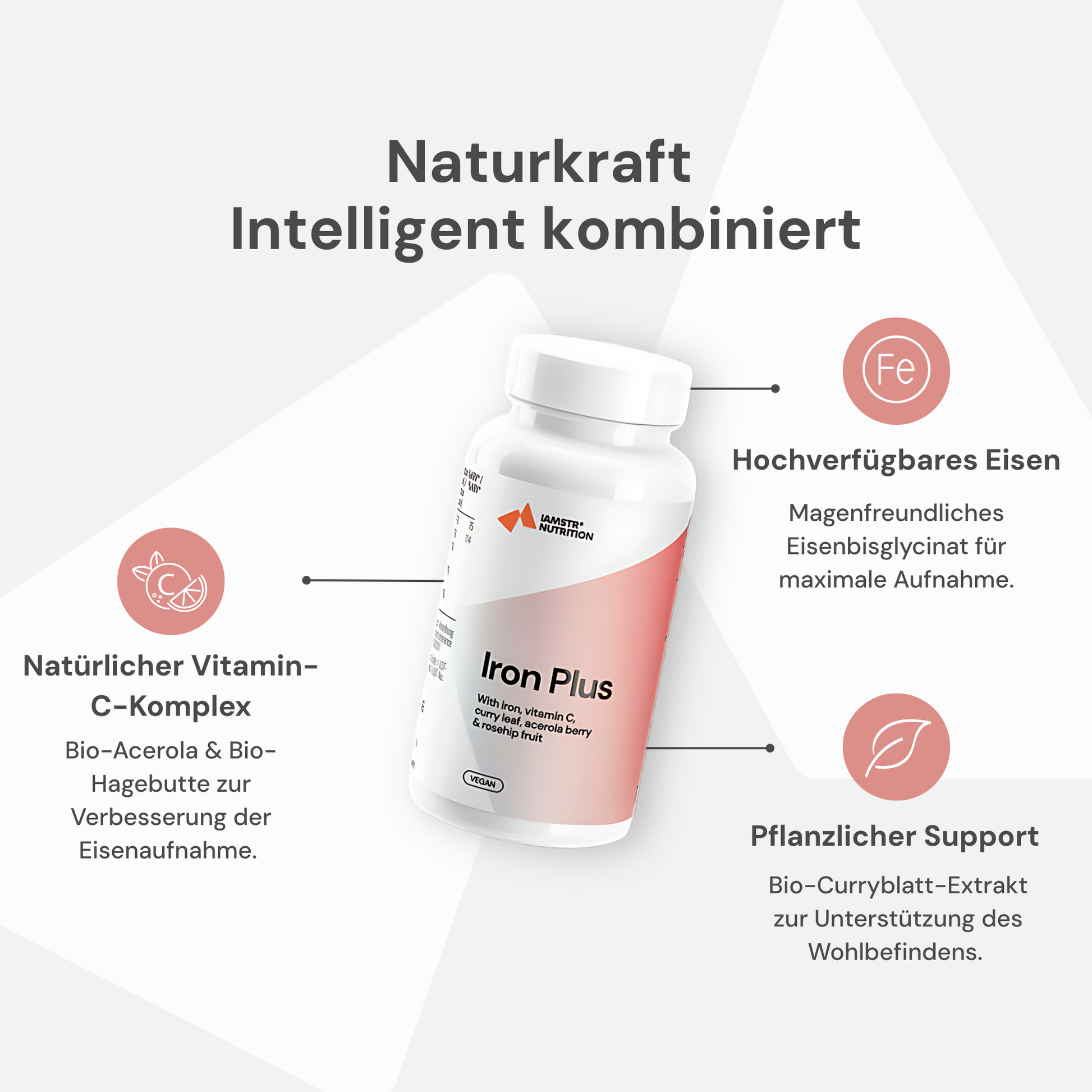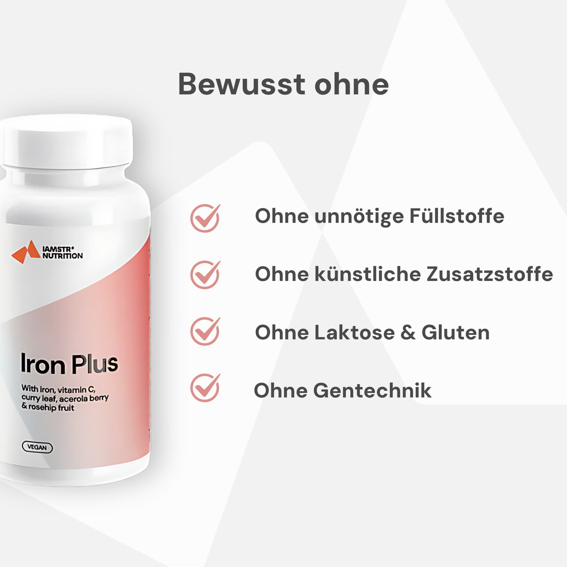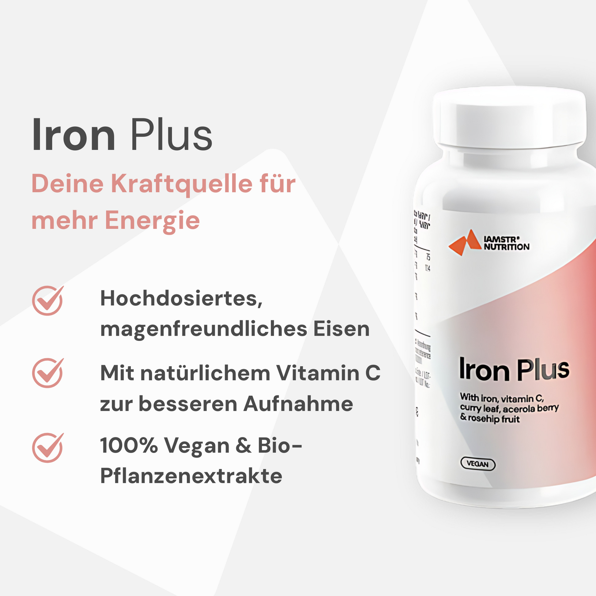 Iron Plus enthält zusätzliche Nährstoffe wie Vitamin C, die die Aufnahme von Eisen im Körper verbessern. So stellst du sicher, dass dein Körper das Eisen bestmöglich nutzen kann.