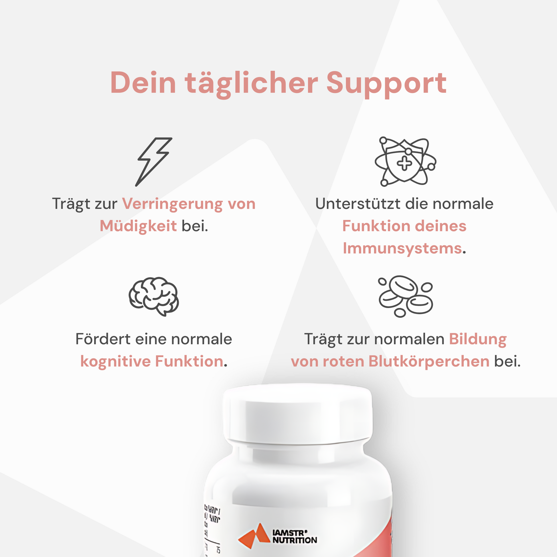 Eisen spielt eine wichtige Rolle bei der Funktion deines Immunsystems. Dieses Supplement hilft dir dabei, gesund zu bleiben und dein Immunsystem zu stärken.