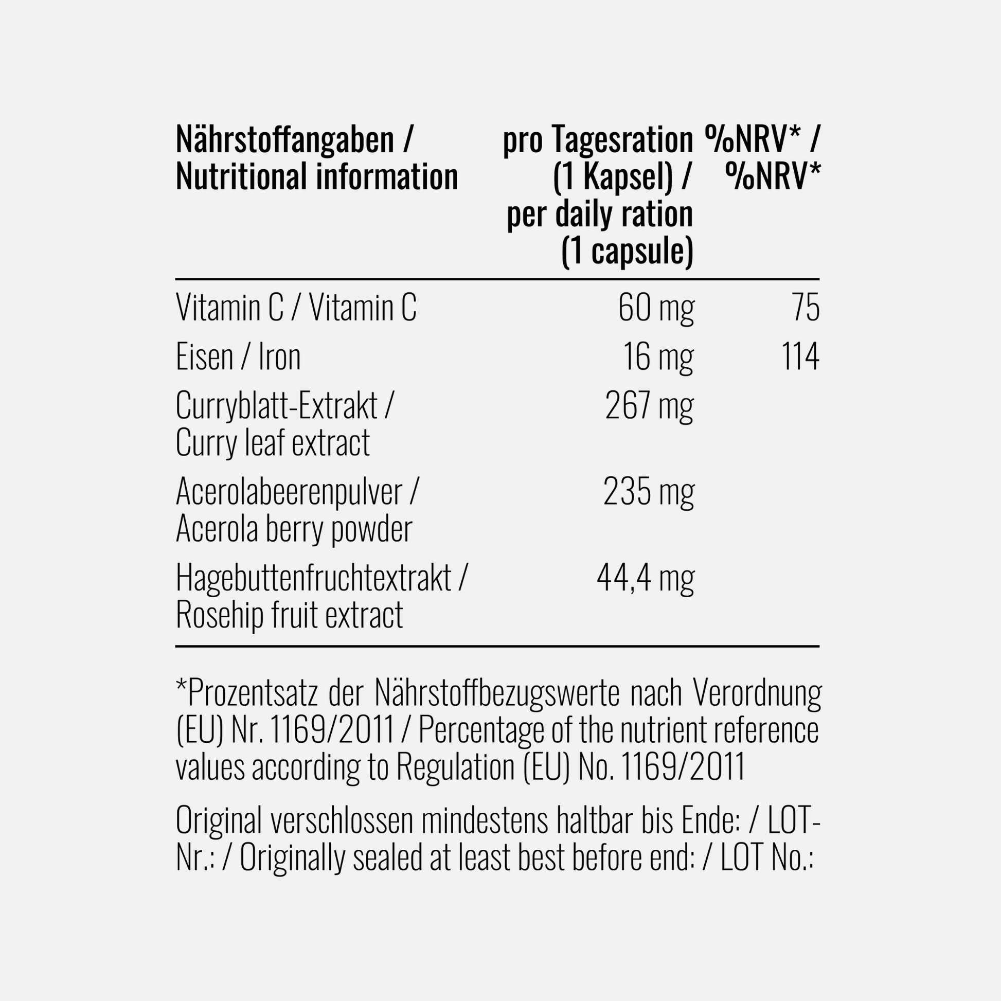 Food supplement with iron and vitamin C. Ingredients: Curry leaf extract, acerola berry powder, hydroxypropylmethylcellulose, rosehip fruit extract, iron bisglycinate.
