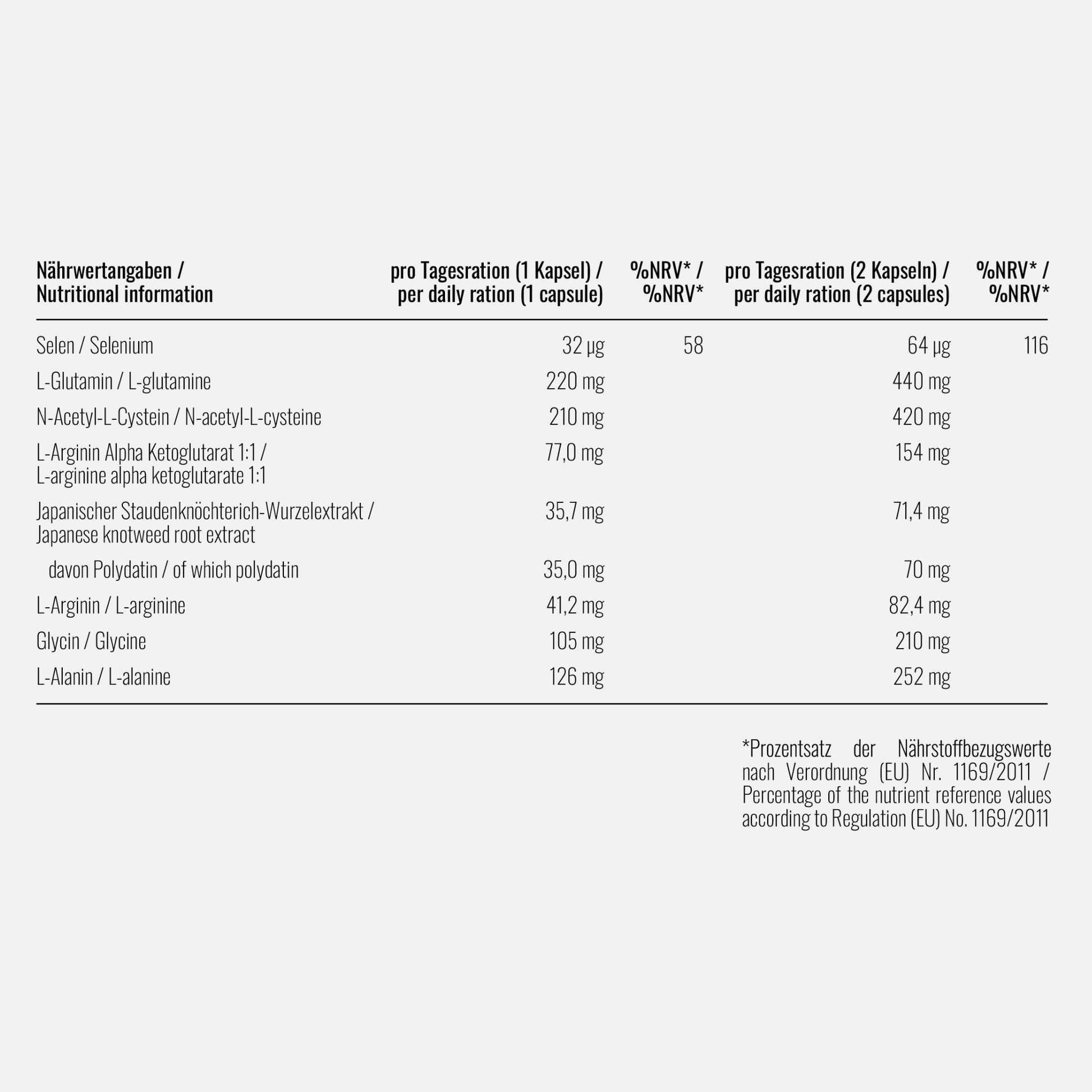 Food supplement with L-glutamine, N-acetyl-L-cysteine and glycine. Ingredients: L-glutamine, N-acetyl-L-cysteine, L-alanine, hydroxypropyl methylcellulose, glycine, L-arginine alpha ketoglutarate 1:1, Japanese knotweed root extract, sodium selenite. Recommended use: Take 1-2 capsules daily with sufficient liquid, preferably with or after a meal.