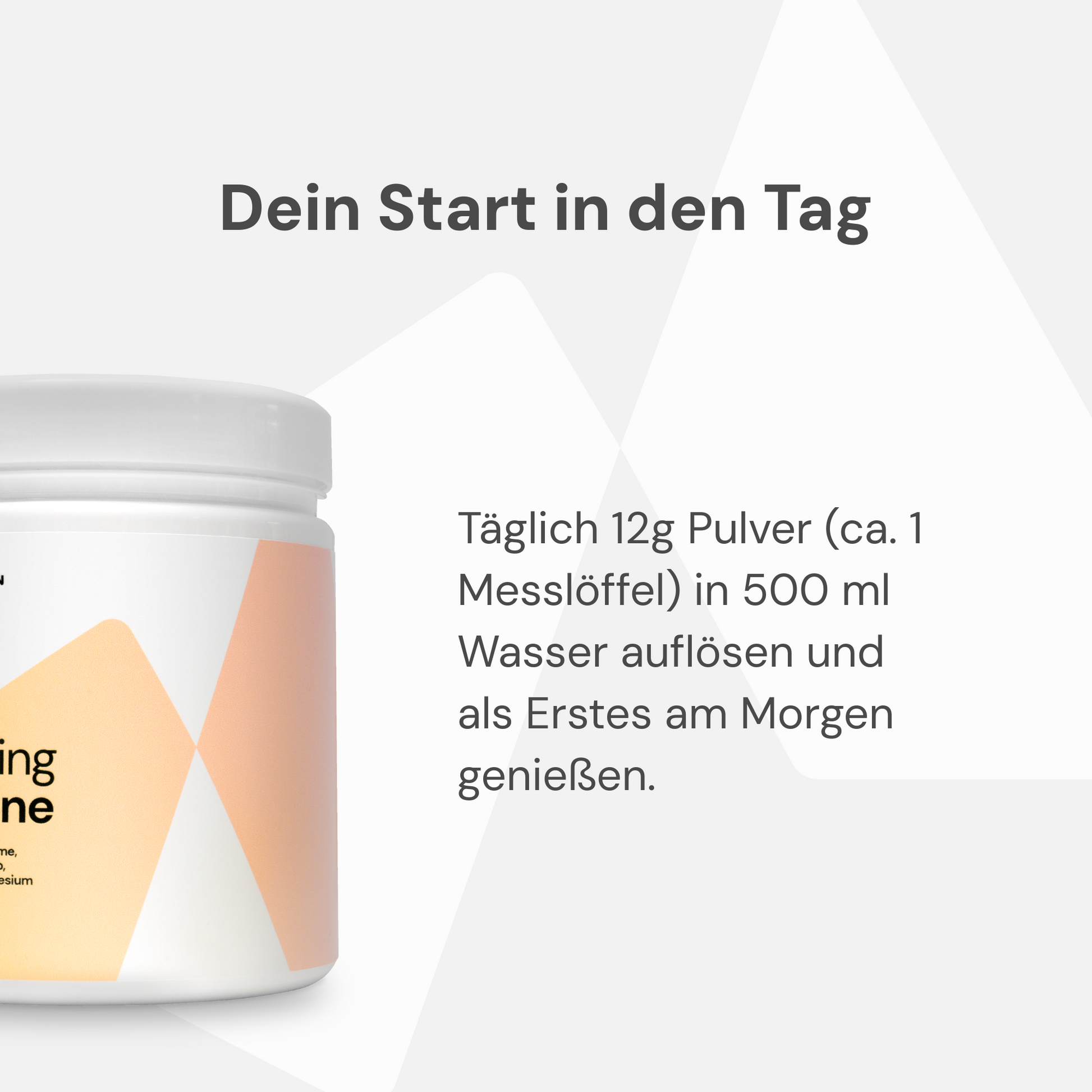 Verzehrempfehlung: Morgens auf nüchternen Magen 15 g (1 gestrichener Messlöffel, Messlöffel beiliegend) in 500 ml Wasser auflösen.