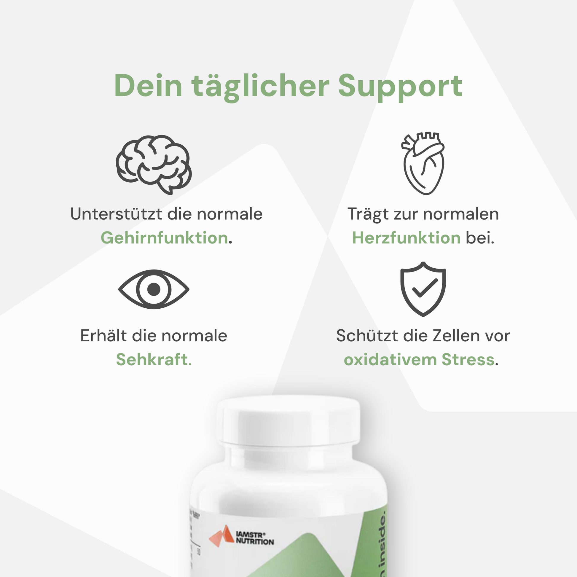 Hinweis: Die angegebene empfohlene tägliche Verzehrmenge darf nicht überschritten werden. Nahrungsergänzungsmittel sind kein Ersatz für eine ausgewogene und abwechslungsreiche Ernährung sowie eine gesunde Lebensweise. Außerhalb der Reichweite von kleinen Kindern lagern.