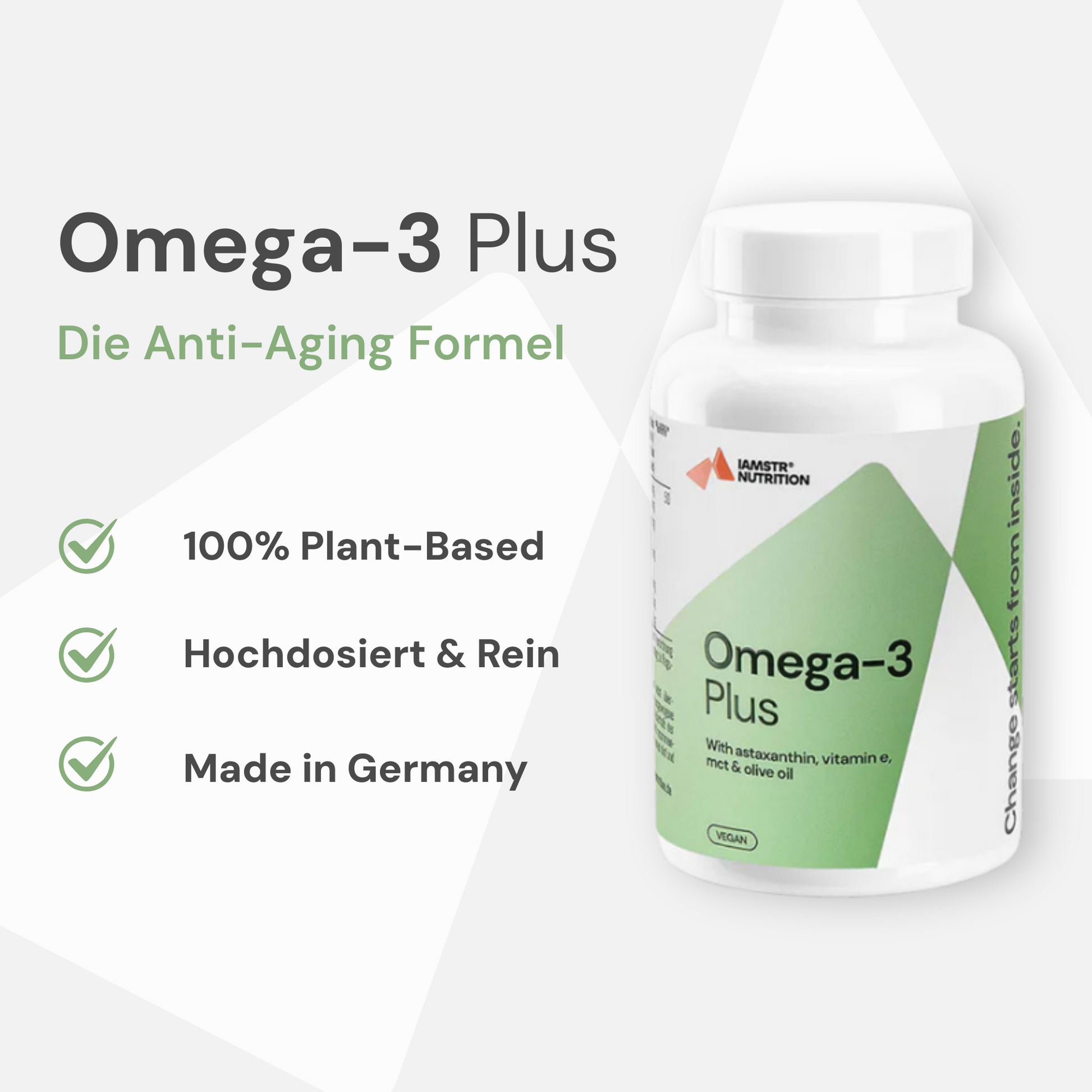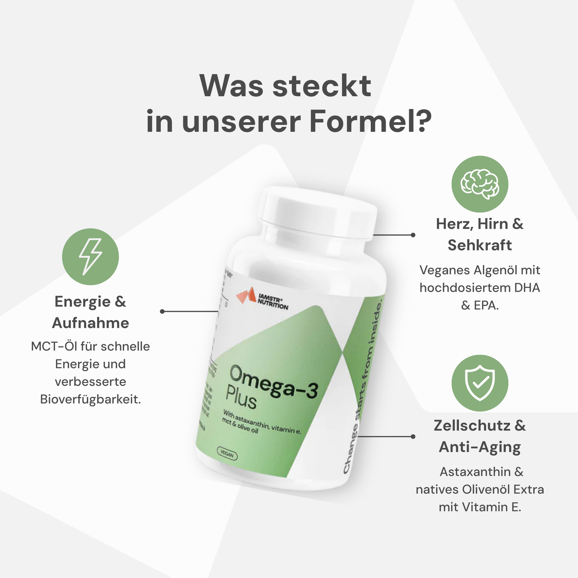 Entfalte das volle Potenzial deiner Gesundheit mit Omega-3 Plus – der Premium-Mischung aus hochwertigen Inhaltsstoffen, die dir täglich eine umfassende Unterstützung für Gehirn, Herz und Augen bietet.