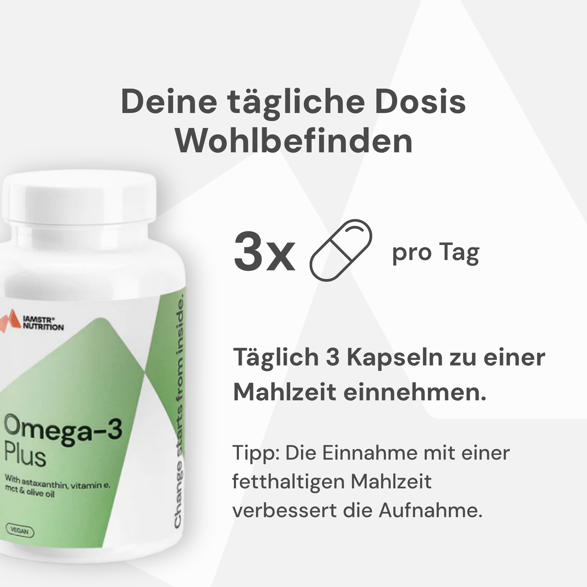 Entdecke das besondere Omega-3 Plus für deine tägliche Wohlfühl-Routine. Unsere einzigartige Formel vereint hochwertiges Omega 3, Astaxanthin, Vitamin E, natives Olivenöl Extra und MCT-Öl zu einem Omega-3 Produkt der Extraklasse.
