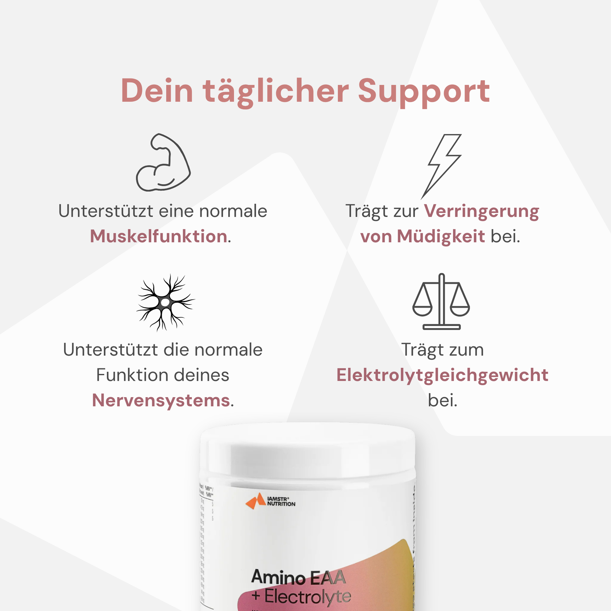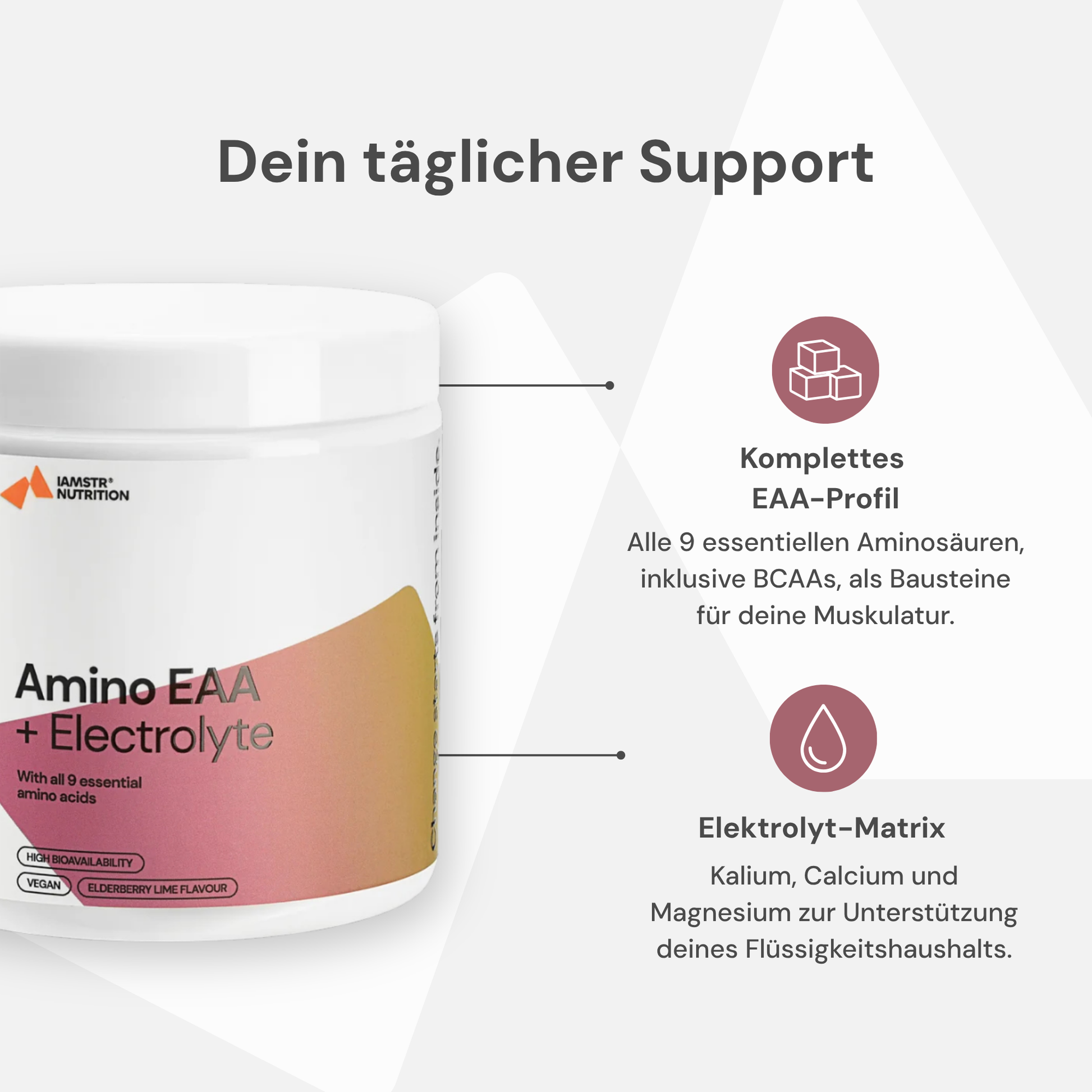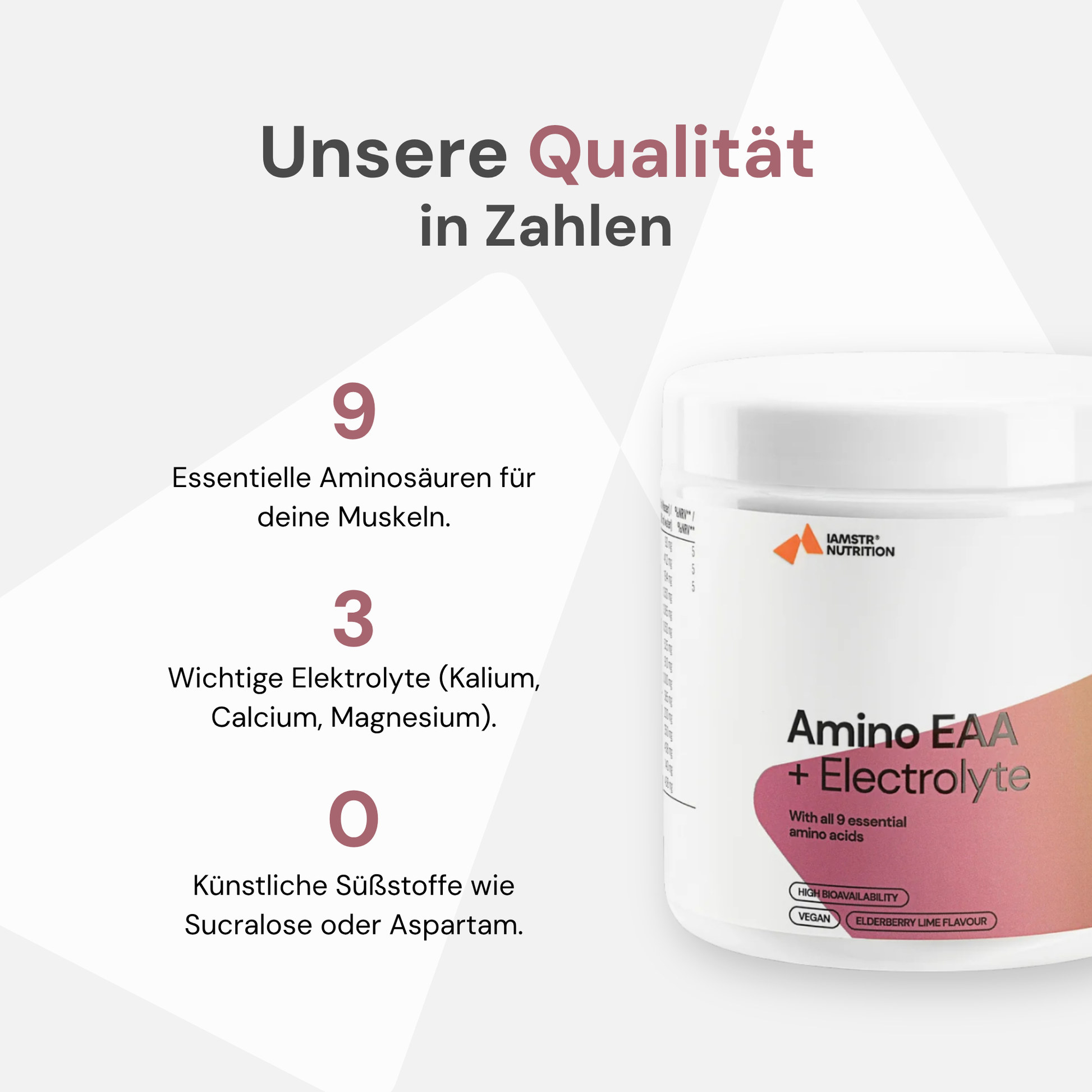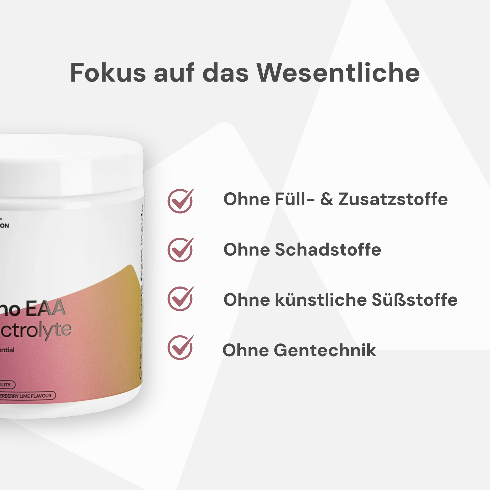 Doch der Gedanke, einen besseren Aminosäuren-Drink zu entwickeln, ließ uns nicht los. Also berieten wir uns mit führenden Fitness-Experten und Ernährungs-Medizinern, um anschließend über Monate hinweg an einer innovativen Formel zu arbeiten. Das finale Ergebnis macht uns mehr als stolz – Amino EAA + Elektrolyte.