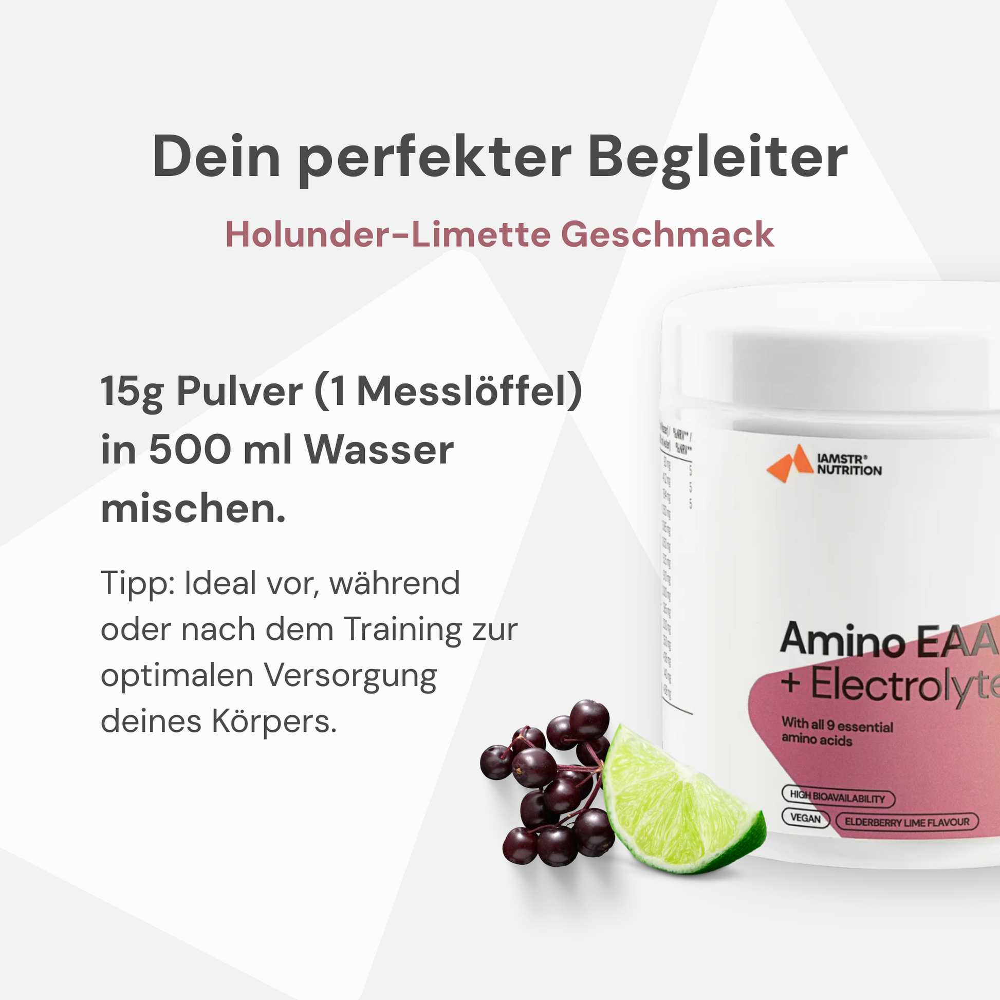 Konkret vereint die Innovation die Vorteile aller neun essenziellen Aminosäuren (inklusive BCAAs) mit wichtigen Elektrolyten in einer optimierten Rezeptur. Das Geniale: Trotz Verzicht auf die typischen Süßungsmittel der Sporternährungs-Branche (Sucralose und Aspartam) haben wir dank einer fein abgeschmeckten Rezeptur einen unschlagbar leckeren Geschmack erreicht. Zugleich kannst du dessen Intensität selbst steuern – je nachdem, wie viel Wasser du hinzufügst.