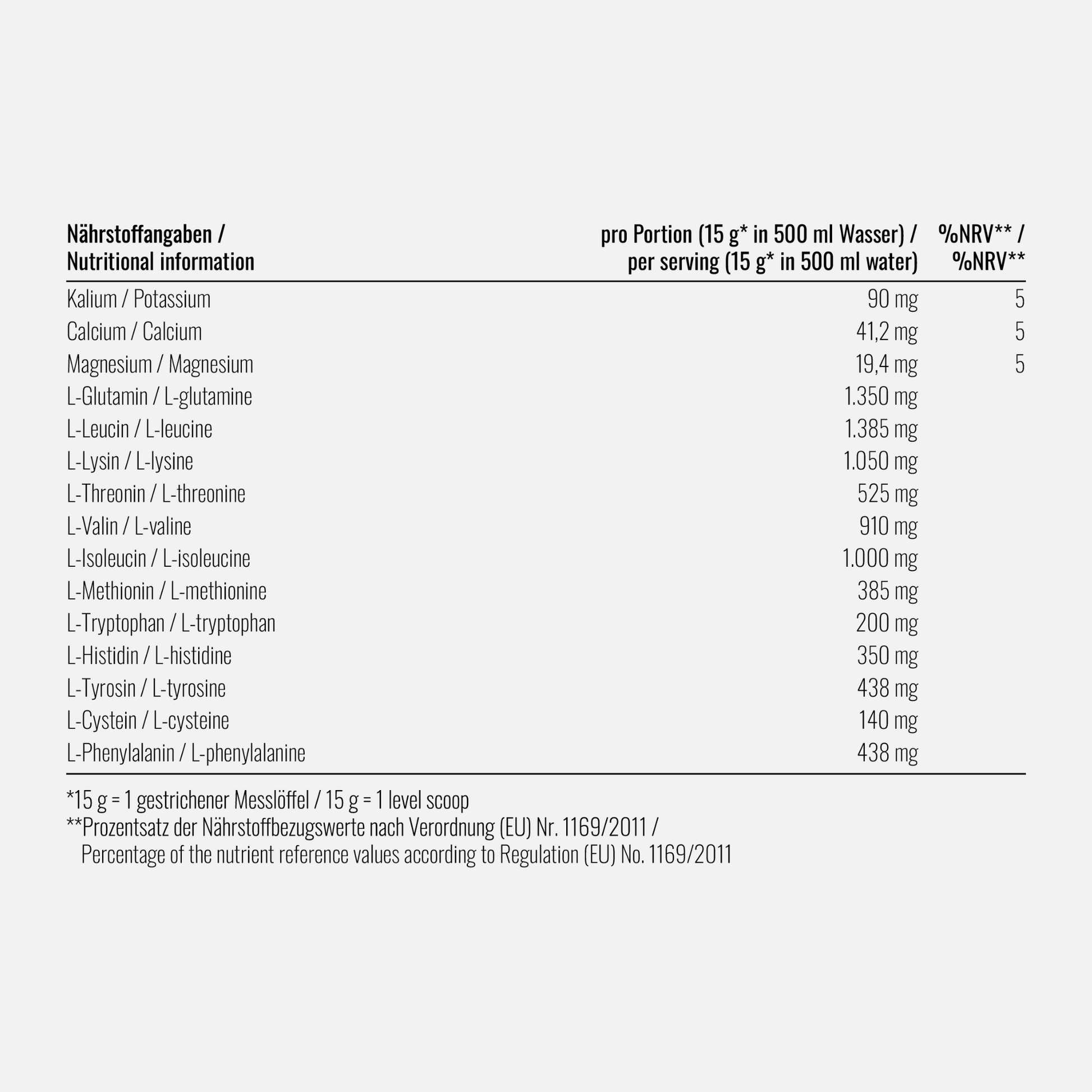 *15 g = 1 gestrichener Messlöffel / 15 g = 1 level scoop amino acids **Prozentsatz der Nährstoffbezugswerte nach Verordnung (EU) Nr. 1169/2011 / Percentage of the nutrient reference values according to Regulation (EU) No. 1169/2011