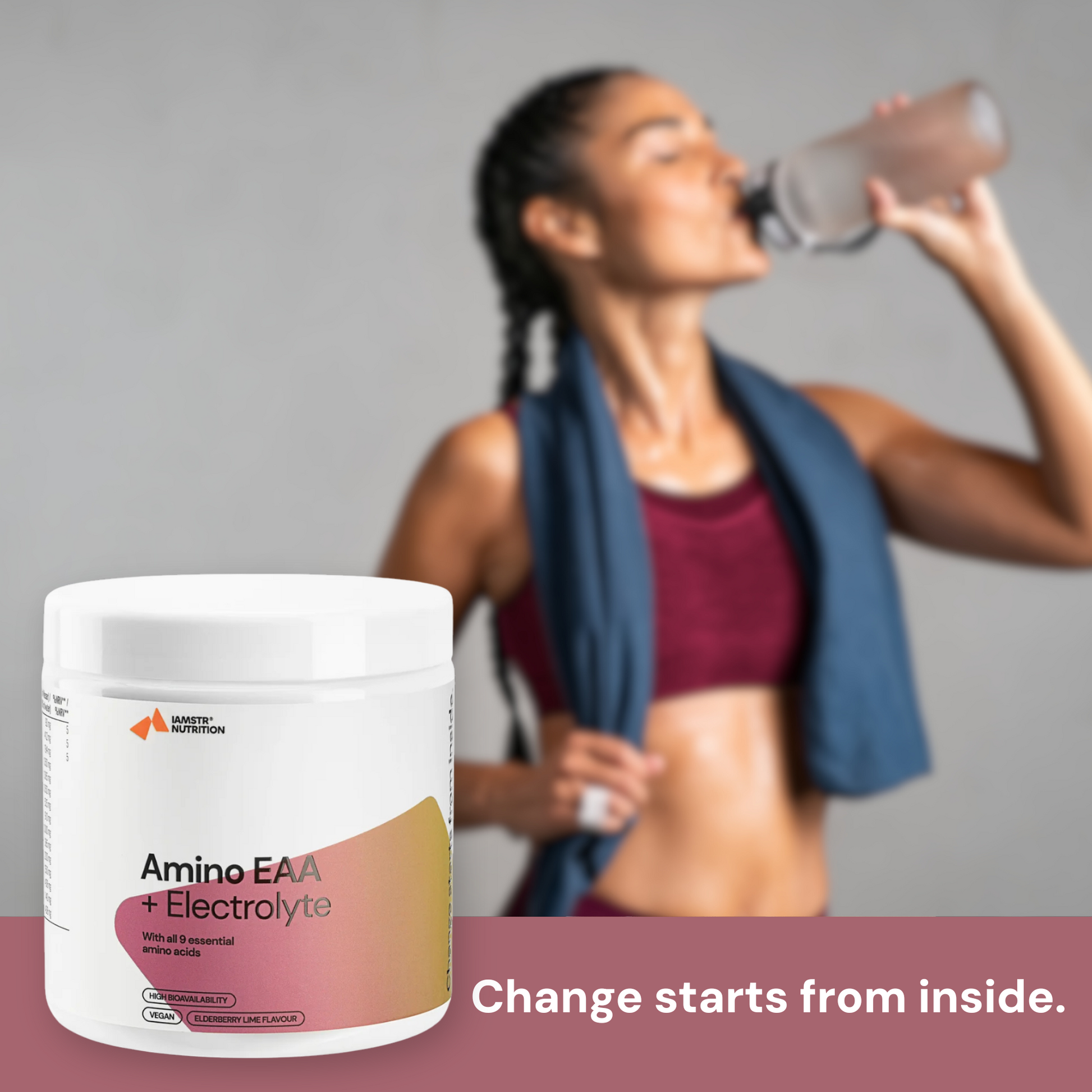 Food supplement with amino acids and sweeteners. Elderberry Lime flavour. Ingredients: Acidifier (citric acid), inulin, L-leucine, L-glutamine, L-lysine hydrochloride, L-isoleucine, L-valine, L-threonine, natural flavouring, L-histidine hydrochloride, L-phenylalanine, L-tyrosine, L-methionine, tripotassium citrate monohydrate, L-cysteine hydrochloride monohydrate, L-tryptophan, trisodium citrate dihydrate, tricalcium phosphate, trimagnesium dicitrate, colouring food (spirulina), Sweeteners (xylitol, erythritol, steviol glycosides from stevia).