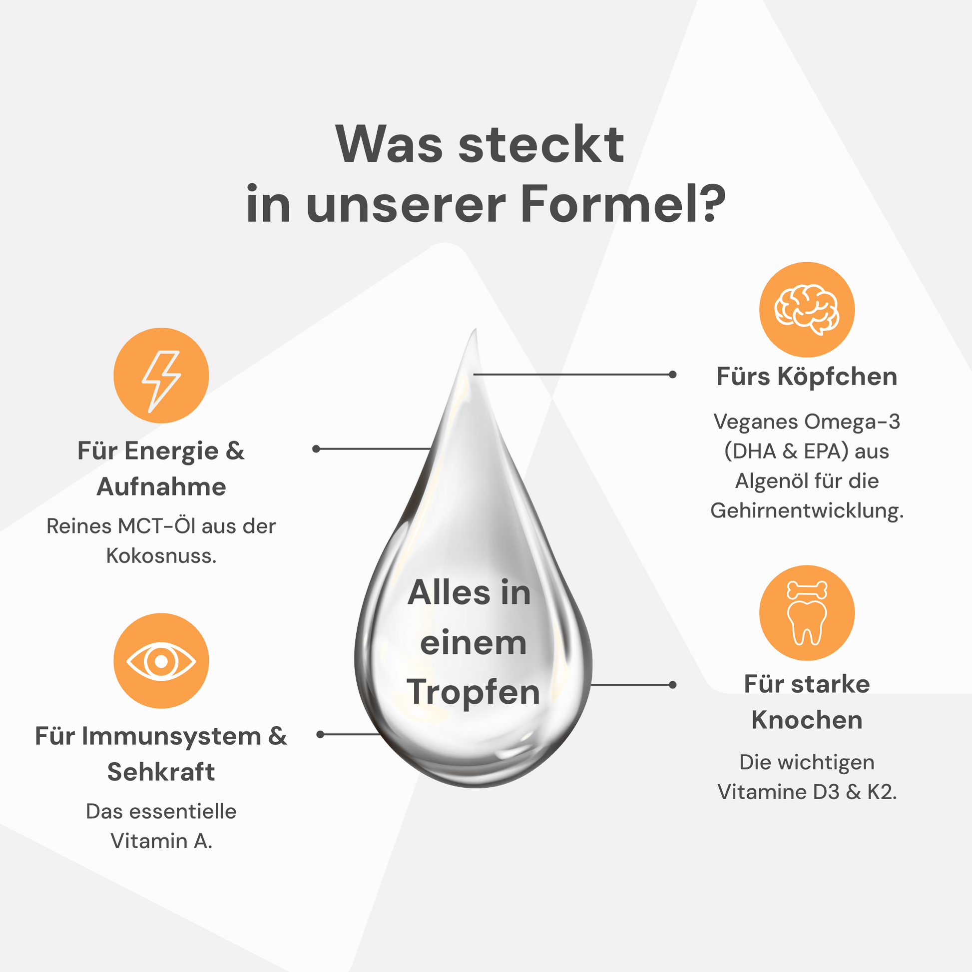 Komplettversorgung für Kinder: Die Kombination aus Omega 3, D3, K2, A und MCT Öl bietet eine ausgewogene Nährstoffversorgung, die das Wachstum, die Energie und die Gesundheit deiner Kinder unterstützt.