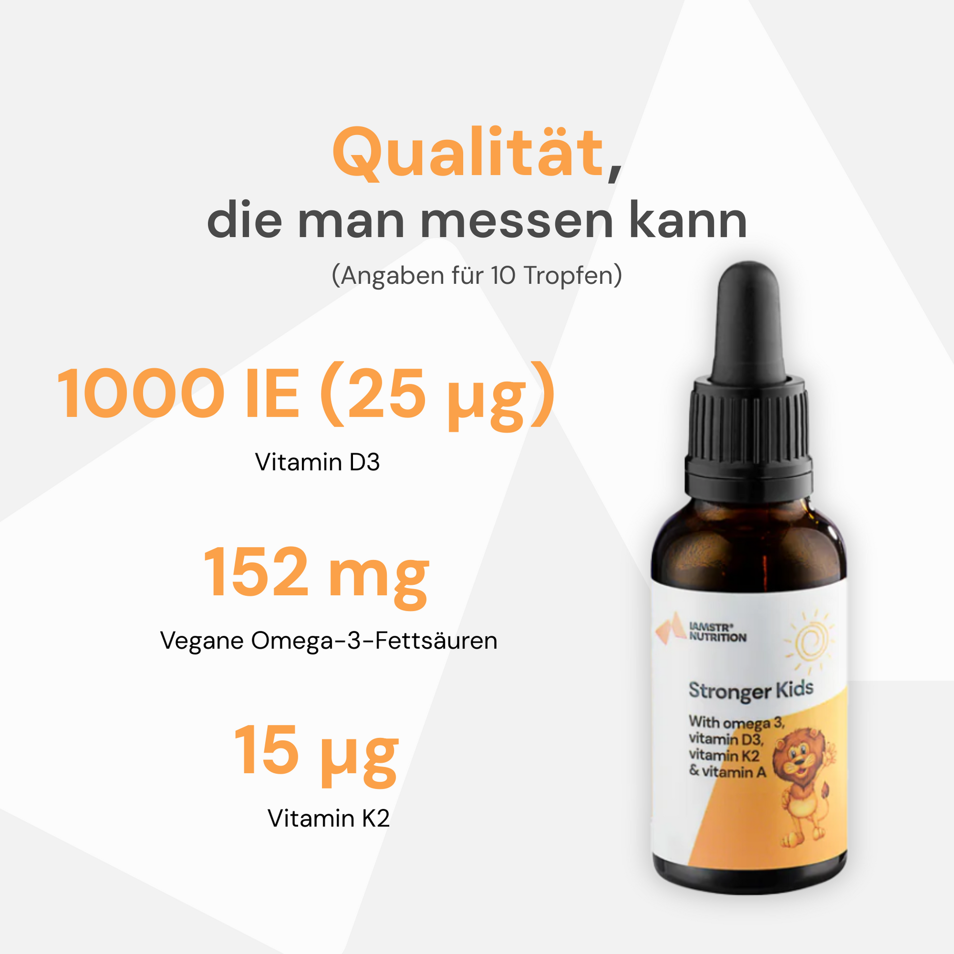 “Nur das Beste für unsere Kinder!” Aus dieser Einstellung heraus ist unser Stronger Kids entstanden, das weder Zucker, Süßungsmittel noch sonstige Zusatzstoffe enthält. Damit unsere Kinder nur das Beste bekommen, stecken in diesem Produkt neben Omega-3-Fettsäuren, auch die fettlöslichen Vitamine D3, K2 und A für die Erhaltung normaler Knochen, eine optimale Sehkraft und die Unterstützung des Immunsystems.