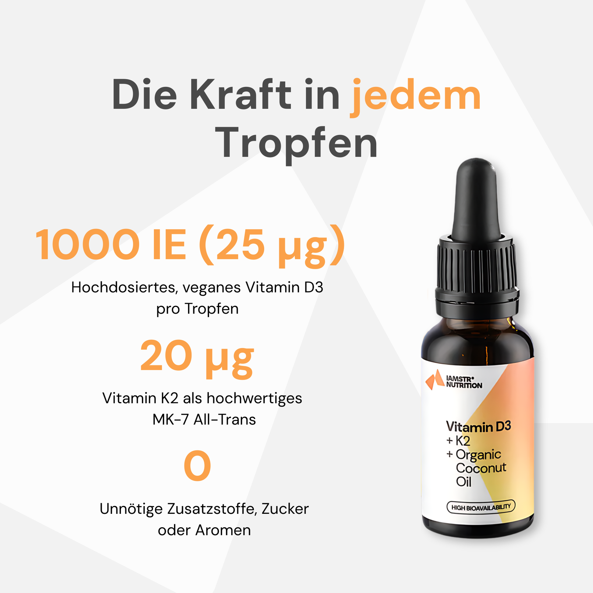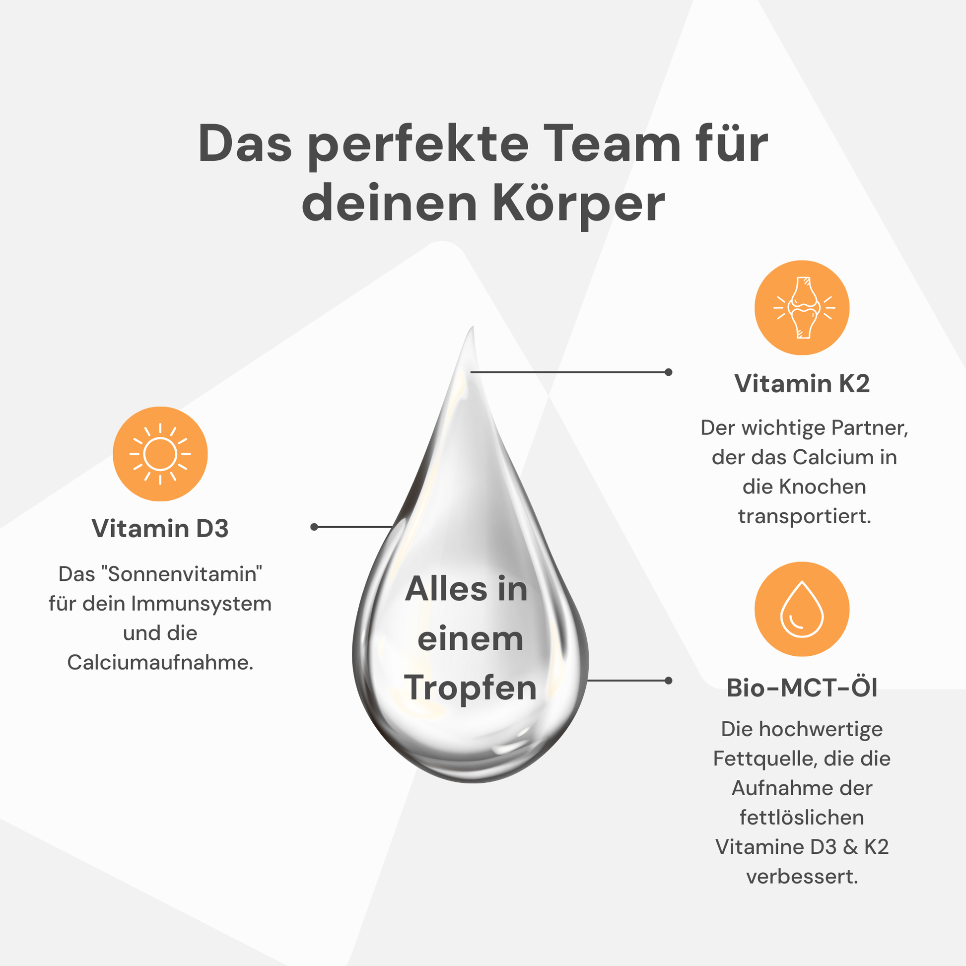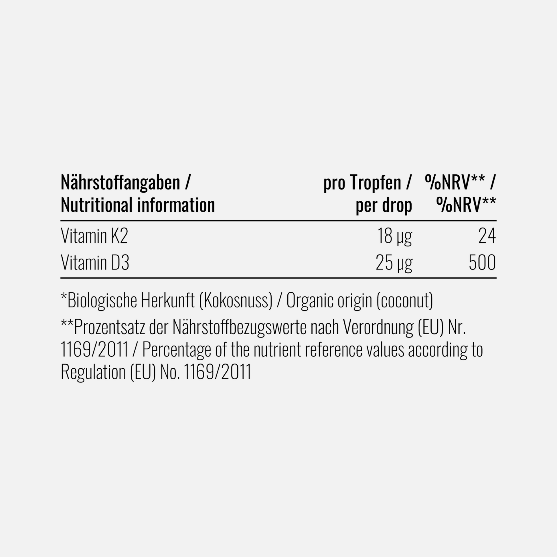 Zutaten: Bio-Kokosnussöl (Pflanzenöl*), Vitamin D3 (Cholecalciferol), Vitamin K2 (Menachion-7).