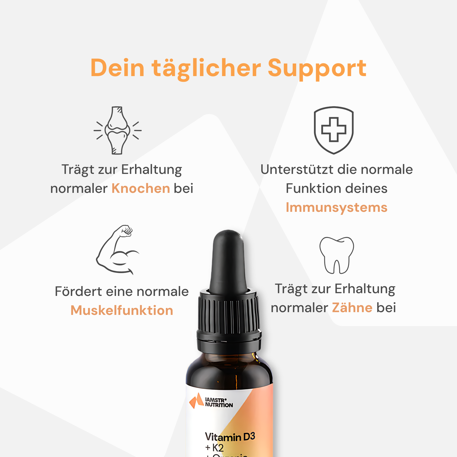 Vitamin D3 unterstützt die Aufnahme von Kalzium und fördert gesunde Knochen und Zähne. Zusammen mit Vitamin K2 sorgt es dafür, dass Kalzium richtig im Körper verteilt wird und in den Knochen und nicht in den Arterien gespeichert wird.