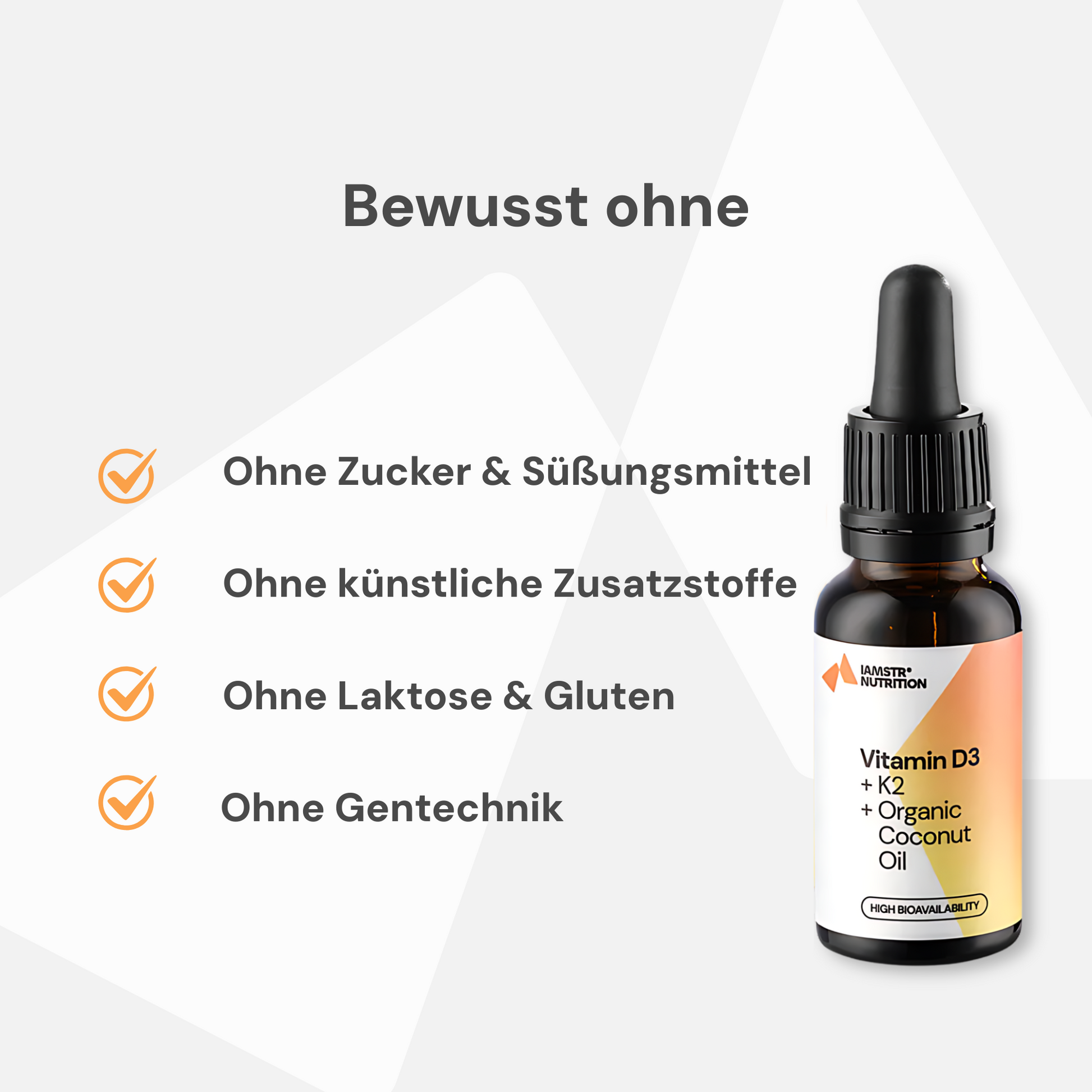 Unser Produkt ist frei von Zusatzstoffen und Süßungsmitteln. Zu finden sind lediglich drei Inhaltsstoffe: Vitamin D3, Vitamin K2 und Bio Kokosnuss Öl, die als Lösung ein absolutes Dreamteam darstellen. Sowohl Vitamin D3 als auch Vitamin K2 sind fettlöslich. Aus diesem Grund haben wir unserem Produkt hochwertiges Bio Kokosnuss Öl hinzugefügt.